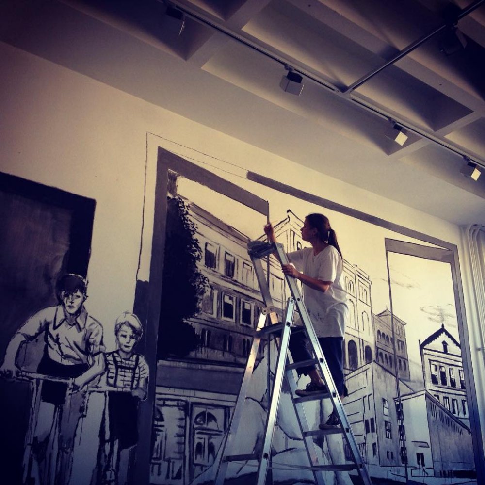Frau Marie Gouil, eine unserer Kolleginnen im Fachbereich Bildende Kunst, führte ihre Arbeit an der Fassade des Leibniz mit einem weiteren Wandgemälde fort - jetzt im Innenbereich. Schauen außen Schülerinnen und Schüler der Neuzeit auf das aktuelle Schulgebäude herab, so sind es innen die Schülerinnen und Schüler der vergangenen Zeit, die dem Betrachter entgegen kommen.