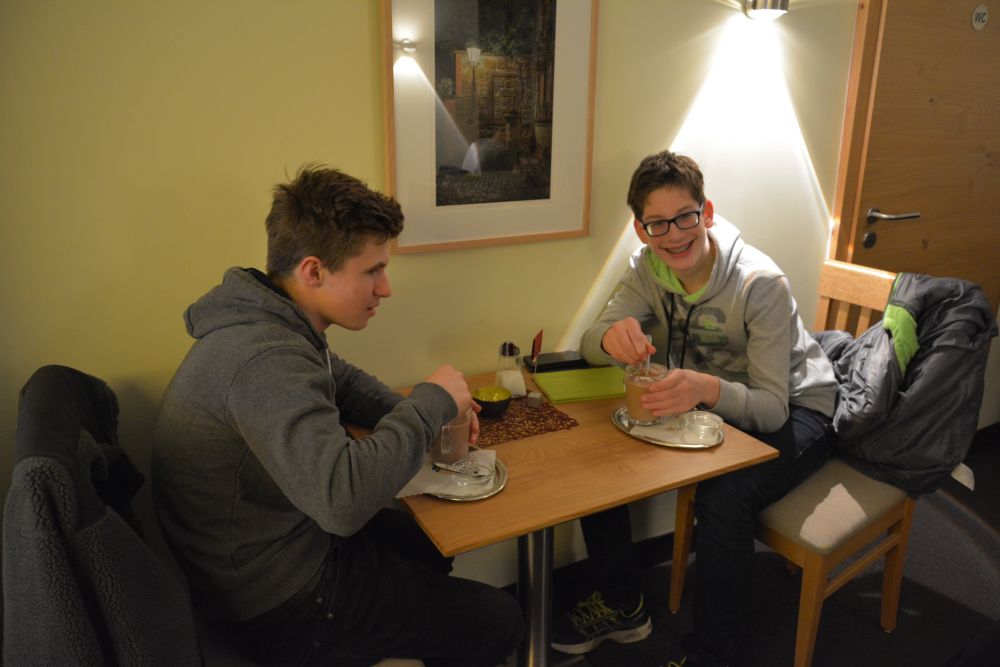Neben aller Tradition gab es aber auch Neues: Erstmals fuhren wir nicht mit dem Linienbus, sondern ließen uns bequem mit einem Reisebus kutschieren. Das war aber auch dringend nötig: Der Busfahrer schaute immer nachdenklicher auf die großen Gepäckberge, die sich nach und nach vor dem Bus auftürmten (Koffer, Orchesterinstrumente, Band-Equipment, Cajon und Schlagzeug), aber letztendlich konnte alles verstaut werden. Leider waren dann aber die Band-Mikrophone und die Fußmaschine des Schlagzeugs so gut im Bus versteckt, dass sie in Bergzabern nicht mit ausgeladen wurden und – zu Frau Knörzers Entsetzen – wieder mit dem Bus Richtung Pirmasens fuhren. Ein Mikrophon konnten wir bei der Jugendherberge ausleihen, aber wo sollte man so schnell eine Fußmaschine hernehmen? Ein Anruf beim Gymnasium Bad Bergzabern brachte die „Rettung": Herzlichen Dank an die dortige Fachschaft Musik, die uns sofort aushalf.