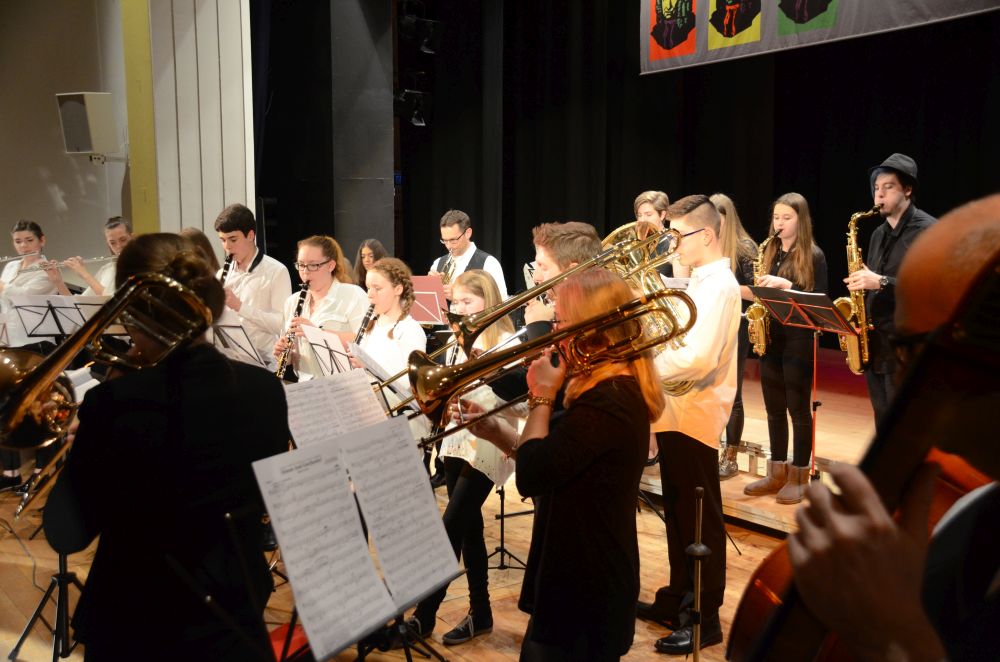 Direkt am Anfang des Abends stand die große, mit Spannung erwartete Premiere der Big-Band-Klasse. Dieses im Schuljahr 2016/2017 erstmals an unserer Schule realisierte Projekt ermöglicht es Schülerinnen und Schülern der 5. und 6. Klassen ein Instrument zu erlernen und das Zusammenspiel im Klassenverband zu trainieren. Nicht nur die sichtbare Spielfreude der rhythmisch wie dynamisch starken Truppe, sondern auch die nach den Neuanmeldungen garantierte Fortsetzung im nächsten Schuljahr bestätigen den Erfolg dieses Projekts.