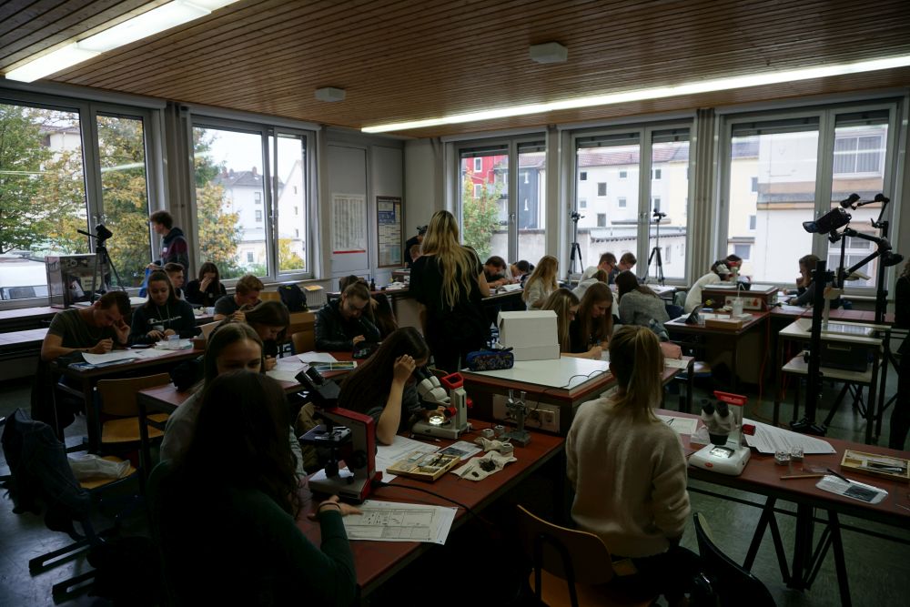 Am 27.09.2019, kurz vor den Herbstferien, besuchten uns auf Initiative von Frau Hoock und Frau Betz mehrere Studenten der Uni Landau für eine Gewässerexkursion in den Strecktalpark. Diese fiel leider, der technischen Geräte wegen, buchstäblich ins Wasser. Da der Regen uns einen Strich durch die Rechnung machte, mussten wir uns darauf beschränken, in der Schule zu experimentieren und machten uns in Kleingruppen aufgeteilt an die Arbeit. Nach einer technischen Einführung untersuchten wir verschiedenste mitgebrachte Wasserproben auf deren chemische Eigenschaften (bspw. pH-Wert oder Sauerstoffgehalt). Außerdem bot sich uns die Möglichkeit, die Wasserproben und damit die verschiedenen Lebewesen der Biotope unter dem Mikroskop zu untersuchen.