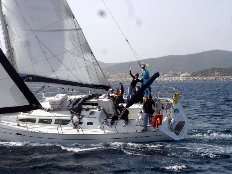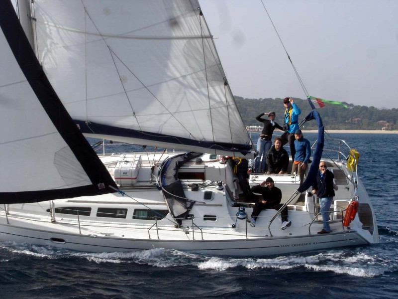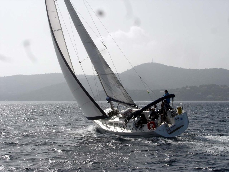 Nach der Anreise in der Nacht von Freitag auf Samstag wurden morgens im Hafen von Hyères zunächst die Formalitäten der Schiffsübernahme erledigt und anschließend der Proviant für die nächsten Tage an Bord gebunkert. Fortan war die Segelyacht "SEMILLON", eine Sun Odysey 43 (Länge 13,17 Meter), für eine Woche unser zuhause. Gegen 15.00 Uhr machten wir uns auf den Weg nach Bormes les Mimosas, ca. 7 Seemeilen entfernt in Richtung Osten. Vorausgegangen war wie üblich eine Sicherheitseinweisung durch den Skipper an Bord und eine erste Aufgabenverteilung, die sich allerdings erst noch bei An- und Ablegemanövern oder auch unter Segel bei Regattabedingungen bewähren musste. Den Schlag nach Bormes, wo man auf die anderen Teilnehmer der Regatta und die Regattaleitung traf, nutzte man sozusagen als "Warm-Up" für die am nächsten Tag bevorstehende erste Etappe. Bei guten Windverhältnissen und Kurs gegen den Wind ließen sich die Segelmanöver mit der zum großen Teil noch seglerisch unerfahrenen Mannschaft und der noch etwas fremden Yacht vortrefflich ausprobieren und einüben.