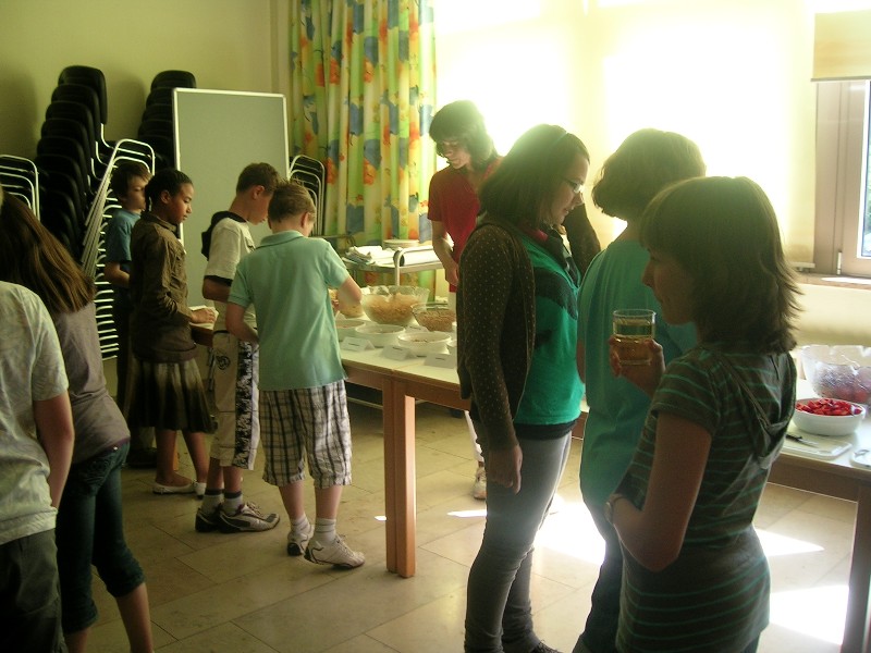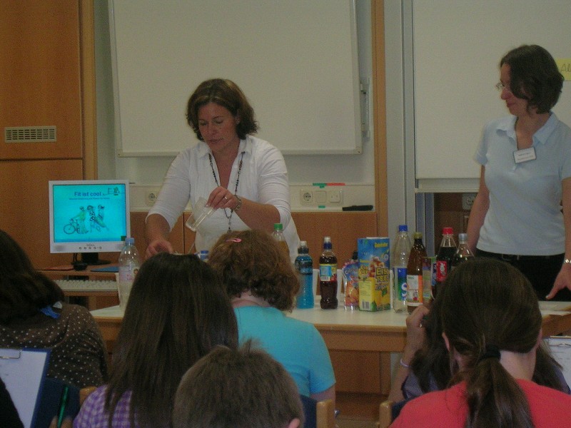 Spielerisch, mit Hilfe des "Zuckerdetektivs", wird aufgezeigt, dass Getränke fit statt dick machen können. Eine Eisteepackung enthält 60 Zuckerwürfel, ein Glas Wasser dagegen keinen Zucker. Danach folgte ein Demonstrationsspiel zur Fragestellung "Wie fühlt sich eine Körperzelle an, die 3 Minuten gearbeitet hat?". Unsere Schüler führten Bewegungsübungen als Herz, Lunge, Muskel, Nervenfasern und Blut aus. Das Aufzeigen einer gesunden Ernährungsweise erfolgte nach dem Besprechen der Ernährungspyramide durch Zubereitung eines Müslis nach eigenen Vorstellungen. Eine Getreidekornquetsche stand zur Verfügung. Anschließend wurden mit Hilfe zweier Kurzfilme verschiedene Formen von Essstörungen besprochen. Am Ende der Veranstaltung erhielt jedes Kind eine Papiertragetasche mit Ernährungstipps und einem kleinen "gesunden" Snack.