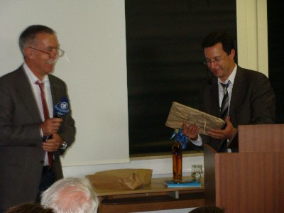 Nach diesem Einblick in das Leben des Korrespondenten, verabschiedet er sich mit den Worten, "Soviel zu mir, zurück nach Pirmasens." Als kleines Dankeschön werden ihm von Schulleiter Dieter Kallenbach "altbewährter Fusel", einige Jahresberichte des Leibniz-Gymnasiums und die Kopien seiner Abiturarbeiten überreicht. "Die Originale, musste ich erfahren, dürfen erst nach 60 Jahren herausgegeben werden", bedauerte Kallenbach.