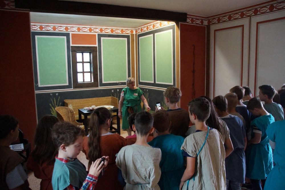 Zuerst ging es unter kundiger Führung durch die Ausgrabungen und rekonstruierten Gebäude, über die Straßen und durch die Keller der römischen Provinzstadt, deren ursprünglicher Name sich leider nirgendwo erhalten hat. Dafür weiß man aber, dass die örtliche Kneipe von einem Wirt namens Capitolinus betrieben wurde, denn der hatte die Gerätschaften, die sich bei den Ausgrabungen wiederfanden, mit seinem Namen beschriftet. Dort gab es gleich den ersten römischen Umtrunk, Wasser mit Apfelessig versetzt – gewöhnungsbedürftig.