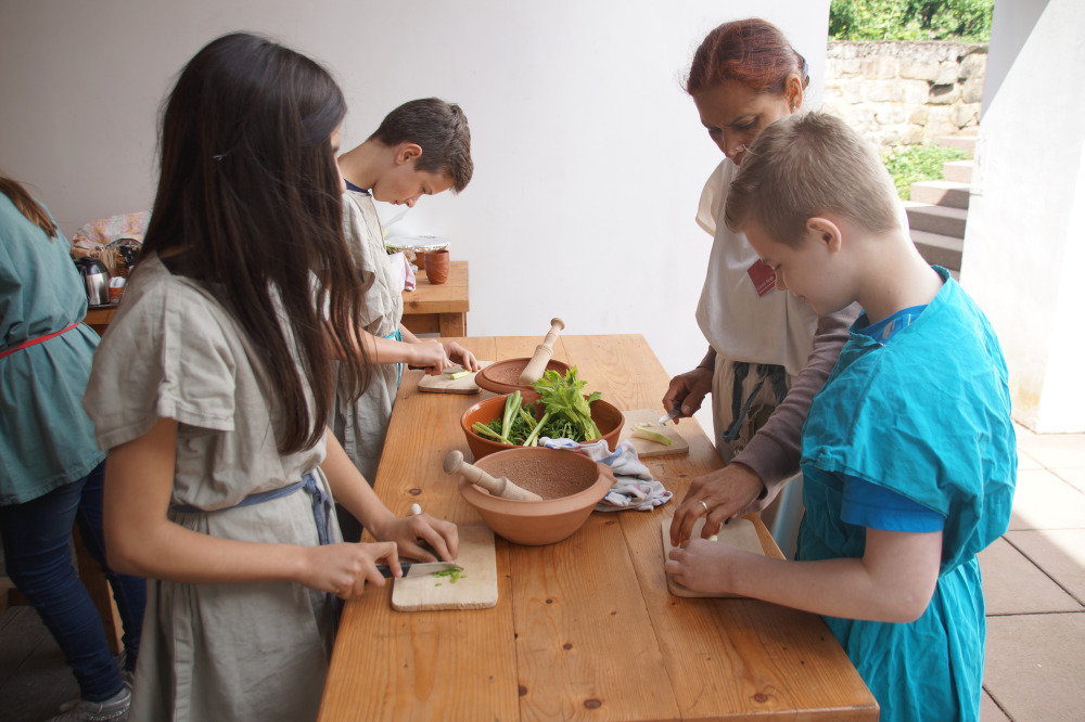 Nach den Besichtigungen wurden die Sechstklässler in zwei Gruppen geteilt: Die Kochsklaven in die Küche, die Handwerker zum Mosaiklegen. Nach einer Stunde wurde getauscht. Vom Mahlen des ganzen Korns in der Steinmühle über das Kneten des Teigs und Kleinschneiden des Gemüses bis zum Rollen der Fleischbällchen war alles ehrliche Handarbeit. Und wer arbeitet, darf schließlich auch essen: „Lecker!" war das häufigste Urteil.