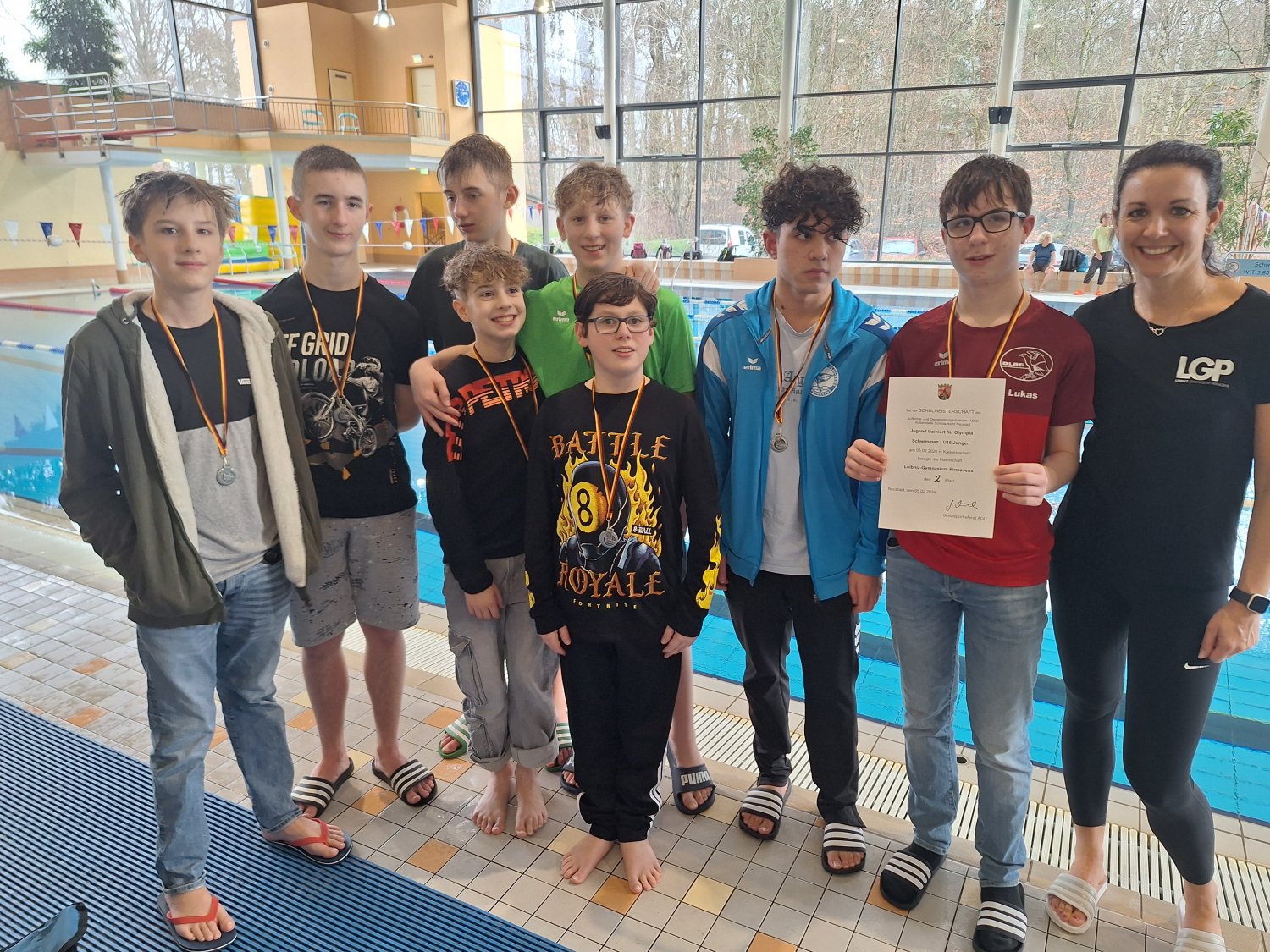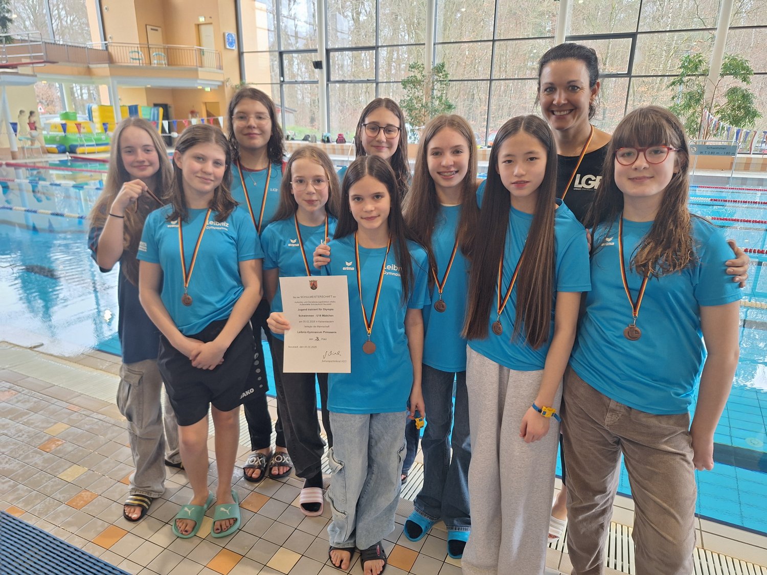 Neben den Einzelstarts überzeugte das Leibniz-Gymnasium auch in den Staffelwettbewerben. Besonders hervorzuheben ist der 3. Platz der weiblichen U18-Lagenstaffel, in der Lisa Schulz, Emelie Matz, Elin Hardegger und Hannah Kuba gemeinsam eine starke Teamleistung zeigten. Auch in weiteren Staffeln mit u.a. Maik Brose, Ben Gimber, Anna Hu und Lara Kuntz bewies die Mannschaft Zusammenhalt, Disziplin und große Einsatzbereitschaft.