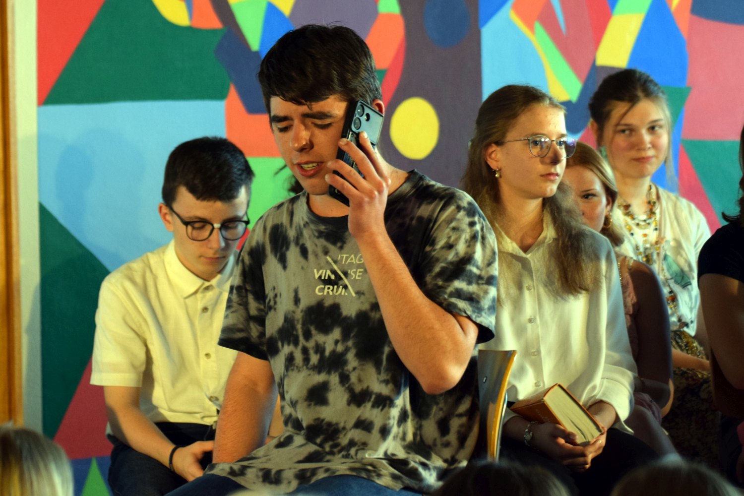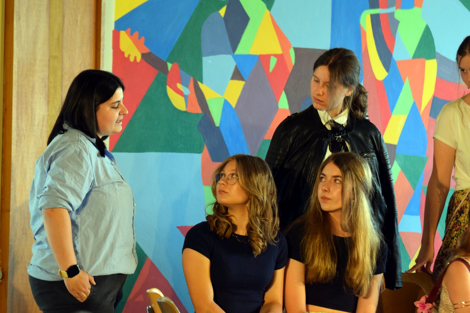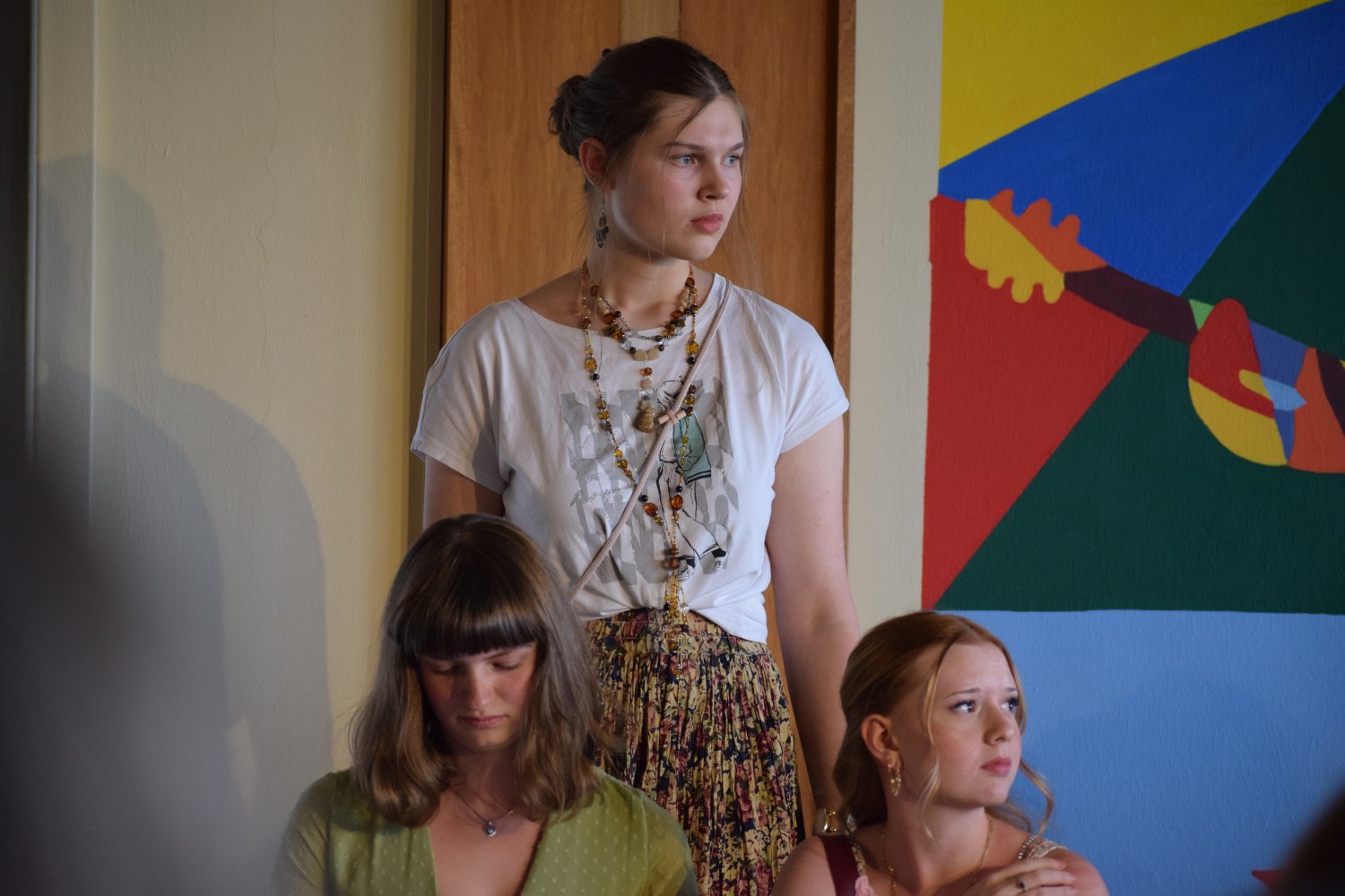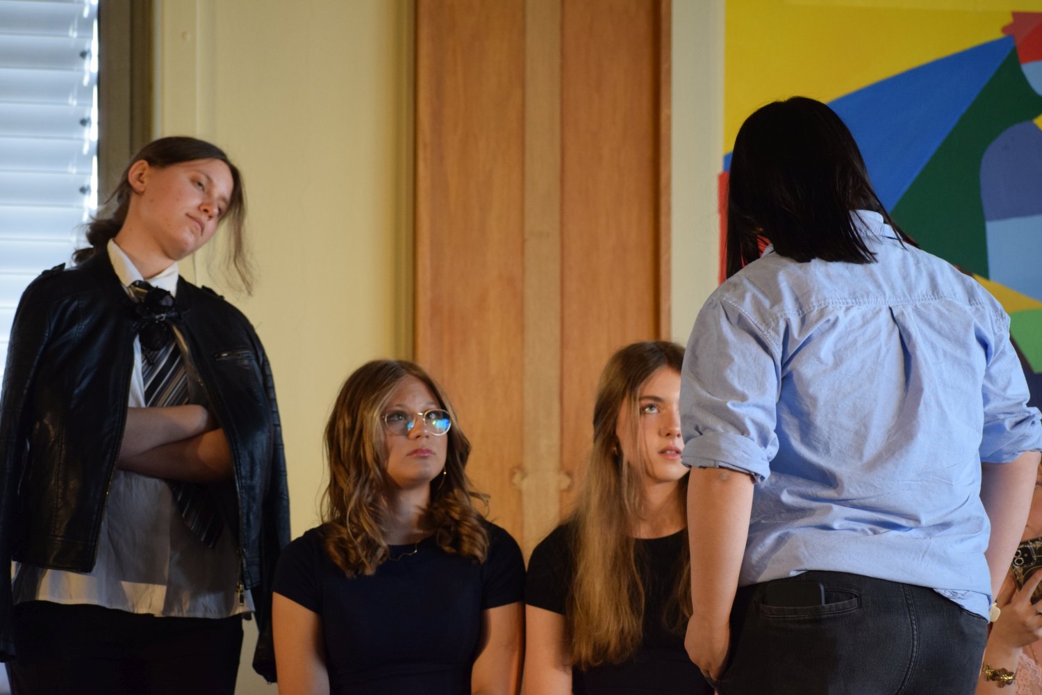 Jetzt musste „nur" noch geprobt werden, einige Szenen wurden immer wieder wiederholt, sodass ja niemand mehr lacht und jeder weiß, wann man wo wie stehen muss. Schlussendlich ging es für die Spielenden ans Texte lernen. Immer und immer wieder, bis jeder seinen Einsatz kennt und den Text aufsagen kann, selbst wenn man um drei Uhr nachts danach gefragt wird. Das alles und noch vieles mehr, nur dass die Aufführungen perfekt werden.
