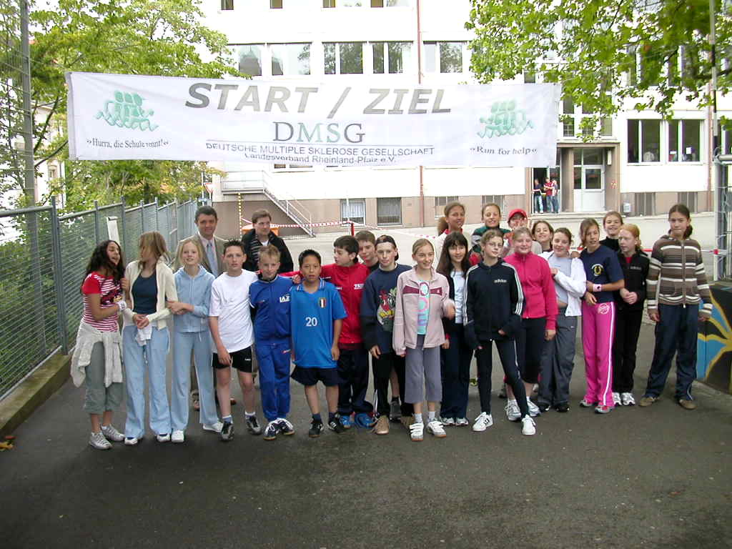 Neben diesen Gesundheitsaspekten übernahm die 6c auch soziales Engagement. Jeder Schüler und jede Schülerin hatte sich Spender und Spenderinnen gesucht, die pro gelaufenen Kilometer eine vorher vereinbarte Summe zahlten. So kamen durch den Eifer von 25 Schülerinnen und Schülern mehr als 1500 Euro zusammen, die der Vertreterin der Deutschen Multiple-Sklerose-Gesellschaft, Landesverband Rheinland-Pfalz, Frau Wingenfeld, überreicht wurden.