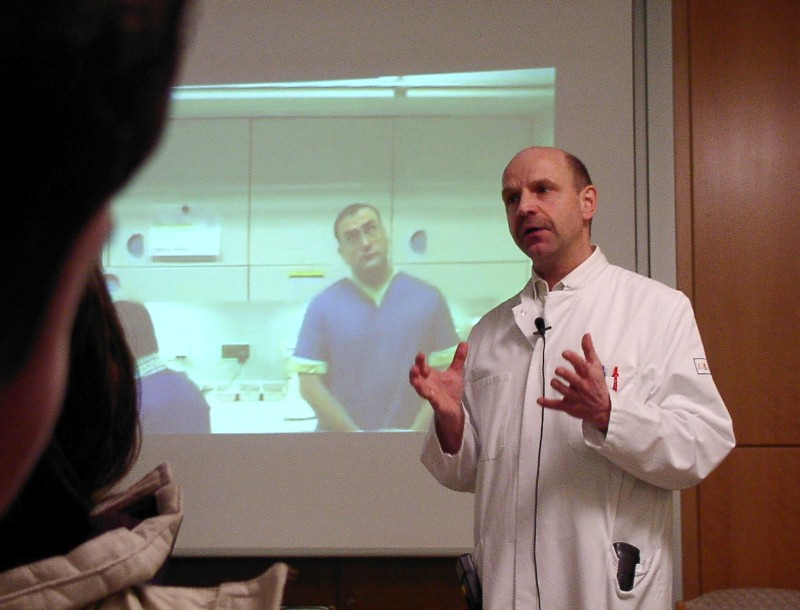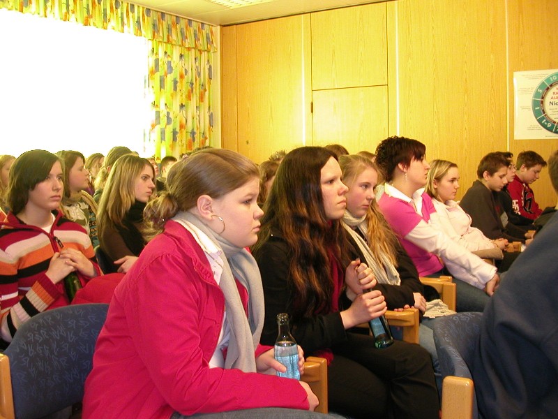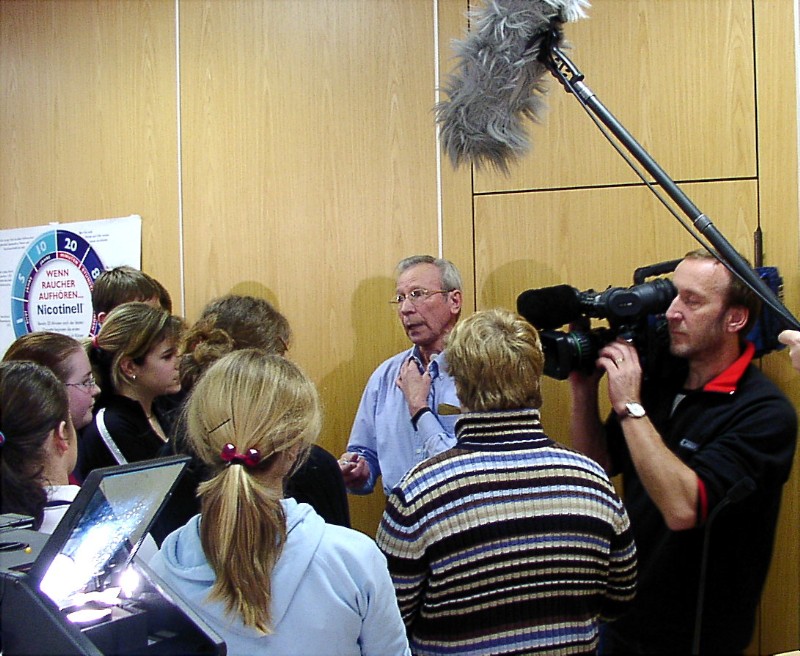 "Aus der Schule gehen - etwas in die Schule mitbringen" steigert die Wirksamkeit der Schule und trägt in hohem Maße zur Lernmotivation bei. Getreu diesem Zitat aus den baden-württembergischen Bildungsplänen 2004 beschreitet das Leibniz-Gymnasium in Zusammenarbeit mit dem Städtischen Krankenhaus Pirmasens neue Wege im Kampf gegen Nikotinsucht. Am Donnerstag, 24.02.05, wurde die achte Klassenstufe des Leibniz-Gymnasiums Zeuge einer Echtzeit-Bronchoskopie. Eine Minikamera begleitet den Weg der Sonde durch Mund und Nase in die Lunge eines Nikotin-Opfers. Dort liefert sie eindrückliche Bilder des Schleims, von Wasser und den abgestorbenen Zellen in den Atmungsorganen des Patienten. Die sich anschließende Diskussion mit Medizinern, Suchtberatern und mit Patienten, die über ihre persönliche Raucher-Karriere berichten, rundete das Vorbeugekonzept gegen Rauchen ab.