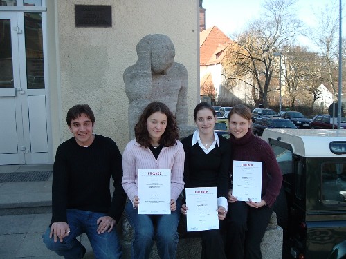 Von rechts: Christina Weigert ( 1. Platz und zwei Sonderpreise im Landeswettbewerb), Steffi Niederheiser ( 2. Platz und ein Sonderpreis), Lena Ankner ( 3. Platz und ein Sonderpreis) präsentieren ihre Urkunden; daneben der betreuende Lehrer Markus Hübner.
