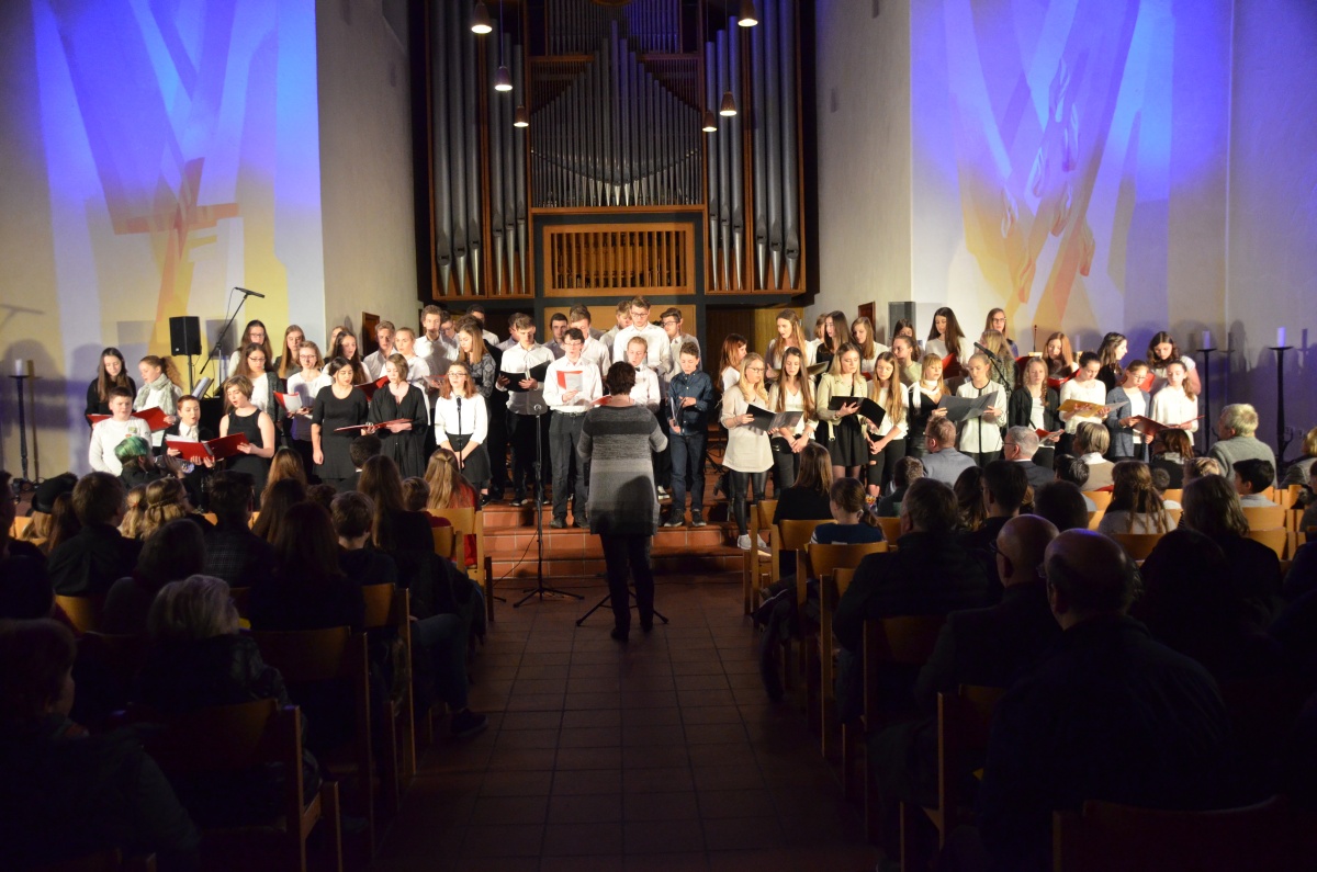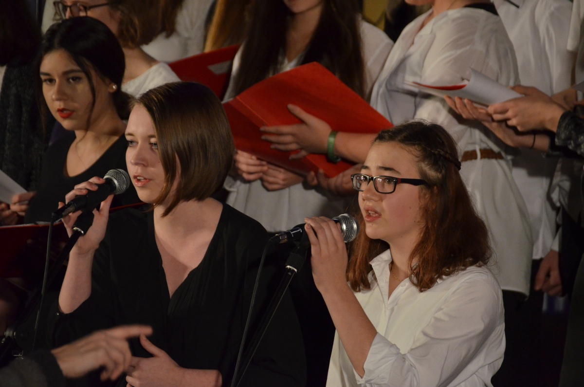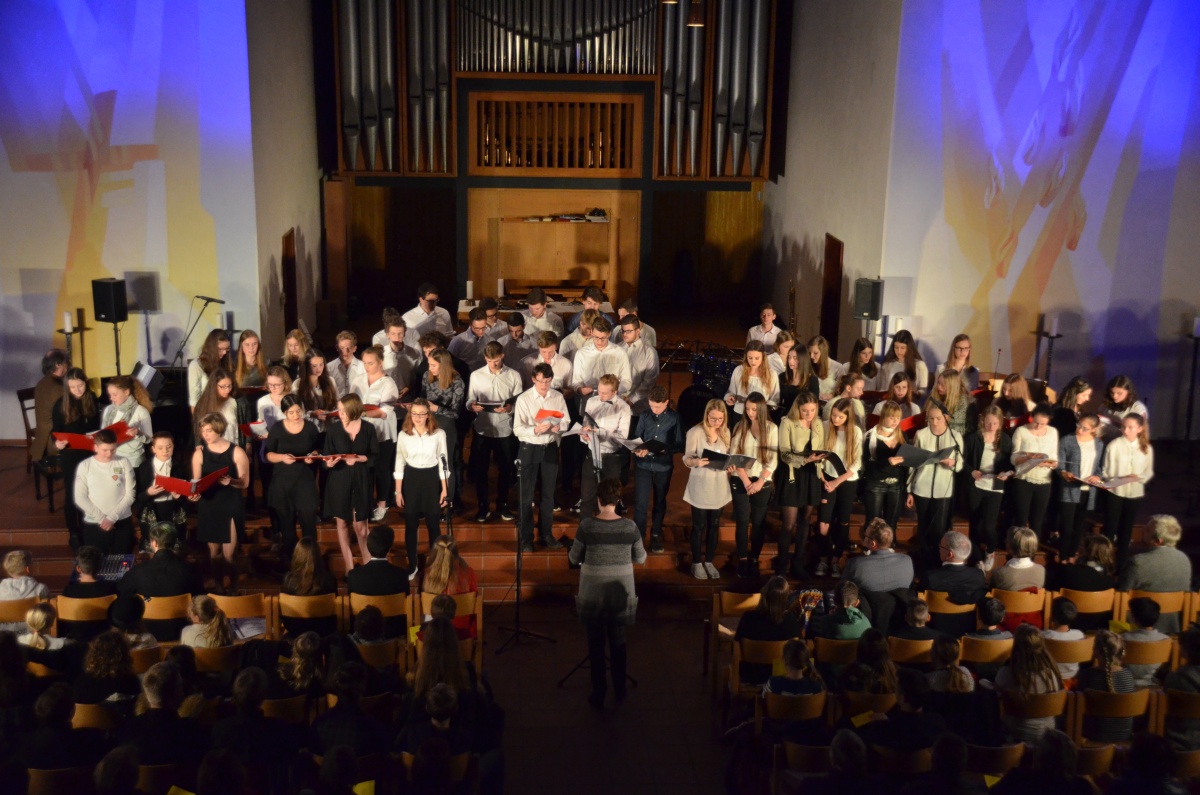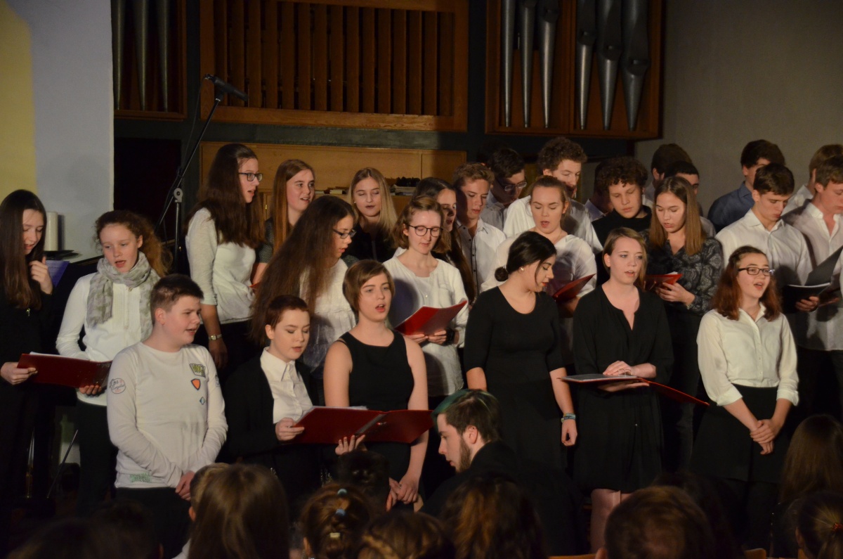 Nach einer kurzen Pause übernahm der Chor der Klassen 8 bis 13 die Bühne und begeisterte, begleitet von Herrn Schlatter am Flügel, mit einer Auswahl an Liedern von Adele. Anspruchsvoll gesetzt und im Wechsel mit überzeugenden Solistinnen, genoss das Publikum einen Querschnitt durch das Album „21“, das schon jetzt zu einem Klassiker der Popgeschichte avanciert ist.