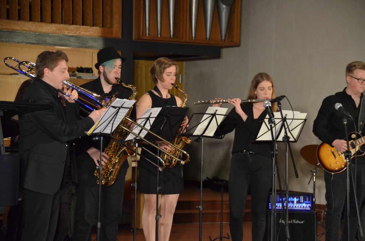 Einen jazzigen Schlusspunkt setzte Schulband LGProject mit den Nummern „Song for my father“, “Cantaloupe Island”, „Something got a hold on me“ und „At last“. Auch hier brillierten neben der gekonnt-groovenden Rhythmusgruppe die Gesangs- und Instrumentalsolisten.
