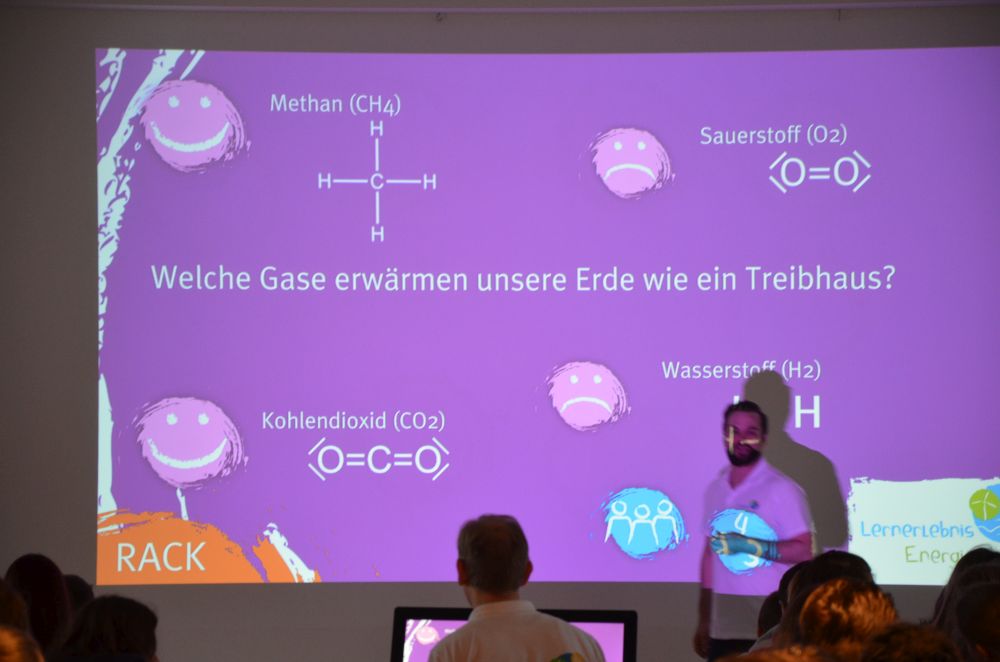 Dabei führten zwei Moderatoren durch ein kurzweiliges Programm mit Quizfragen, Video-Szenen, Activity-Spielen und Informationssequenzen zum Hintergrund der Energiewende in Deutschland (begrenzte fossile Ressourcen, technische Umsetzung alternativer Energieerzeugung und Energiesparens). Die Schüler beteiligten sich engagiert an den interaktiven Elementen.