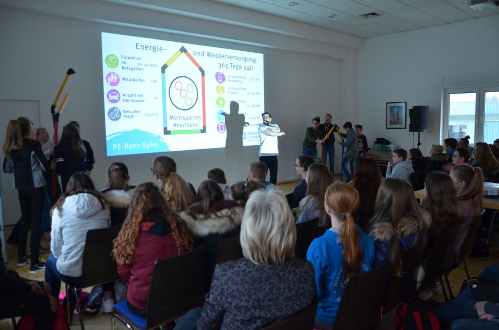 Im Rahmen des „Sonnendiploms" - ein mehrteiliges Bildungsprojekt zum Thema Umweltschutz und Umweltbewusstsein - boten die Stadtwerke Pirmasens in Zusammenarbeit mit dem „Pakt für Pirmasens" eine 90-minütige Informationsveranstaltung an. Alle 7. Klassen besuchten am Donnerstag, den 30.11. dieses „Lernerlebnis Energiewende".