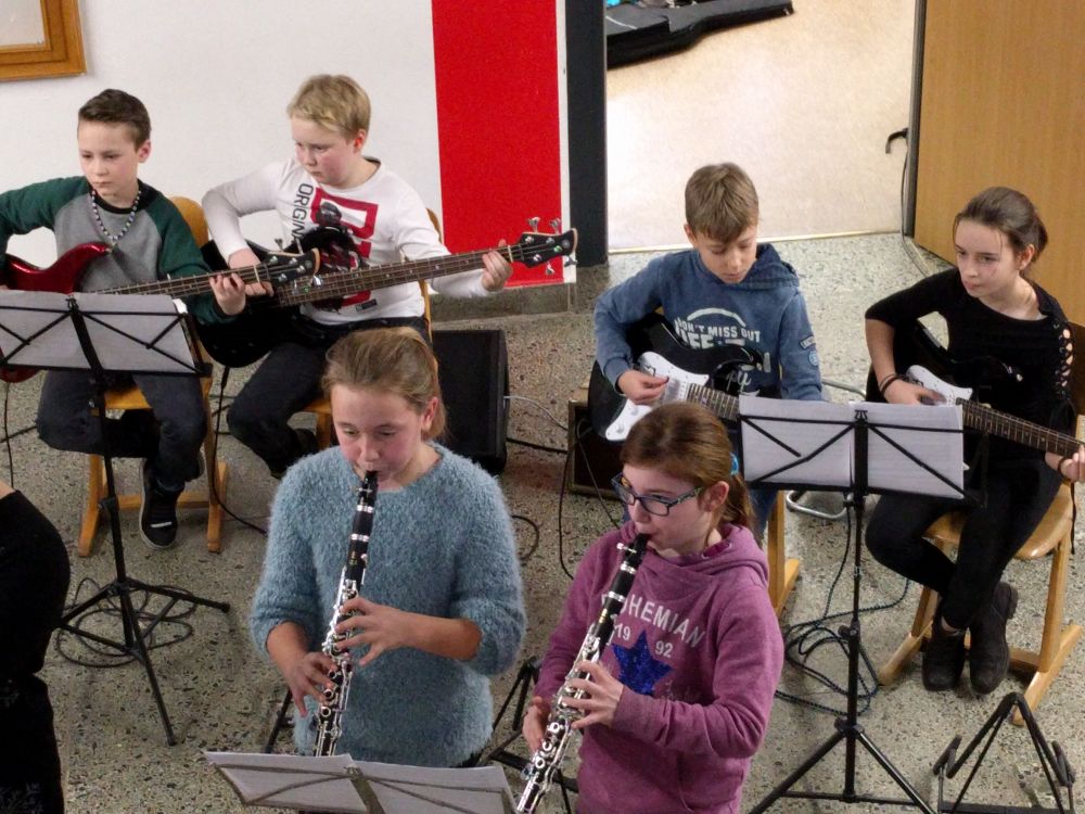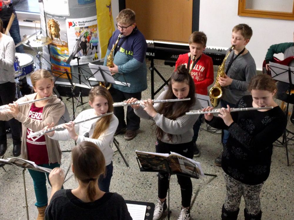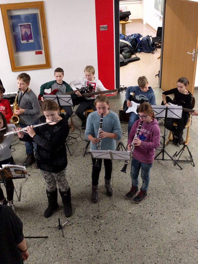 Inzwischen kann man es als schöne Tradition bezeichnen: Am letzten Schultag vor den Weihnachtsferien wird der Schulgemeinschaft in der großen Pause eine musikalische Einstimmung auf das kommende Fest geboten. Nachdem bereits im Vorjahr die Bigband-Klasse diese Aufgabe übernommen hatte, war es auch dieses Jahr der erste Auftritt unserer jüngsten Nachwuchsmusiker aus der Bigband-Klasse.