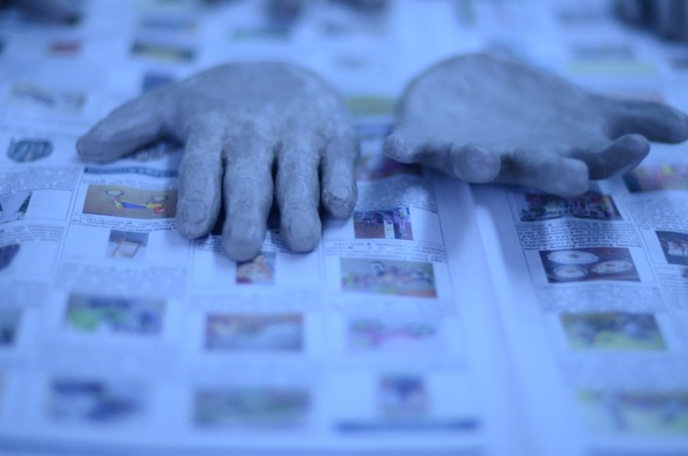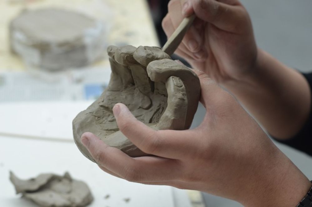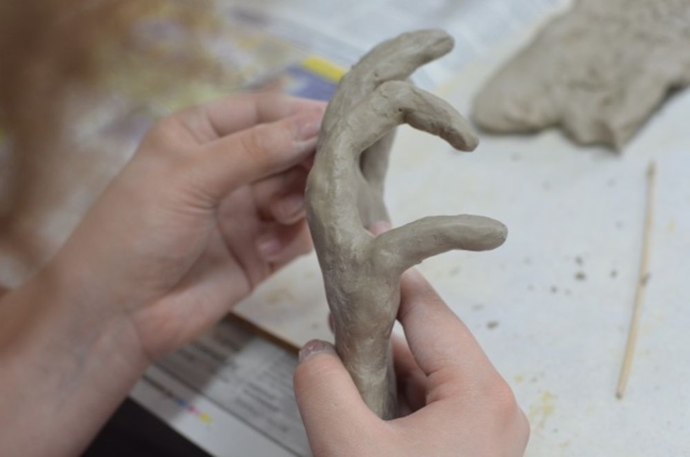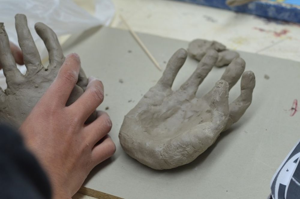 Seit einigen Wochen schon sind die 9. Klassen im Bereich der Plastik zu Hause: Nach Werkbetrachtungen diverser Art (Naumann, Rodin u. a.) modellieren sie nun ihre eigenen Gesten und Handzeichen. Das Modellieren ist eine echte Herausforderung und die Ergebnisse lassen sich sehen!