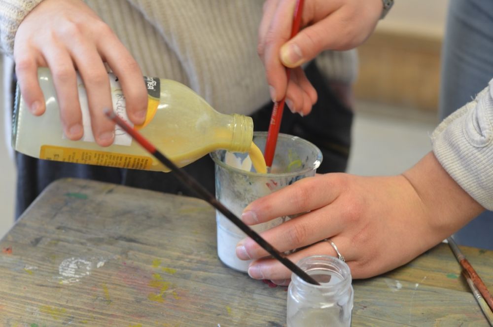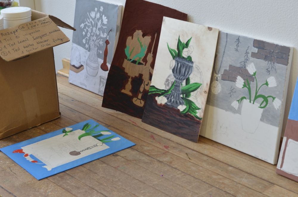 Der GK BK 1 wagt sich derzeit gleichzeitig an symbolgeladene Motive, angelehnt an die Vanitasstillleben des Barock, und an eine sehr alte Maltechnik aus dem Mittelalter, die Eitempera. Die SuS sind einerseits damit befasst, sich mit allgemeiner Symbolik und eigenen Bildideen, Intentionen auseinanderzusetzen, andererseits üben sie sich im Bindemittel für Farbpigmente Herstellen und im komplexen Mischen von Farbwerten. Die Fotos dokumentieren den Prozess.