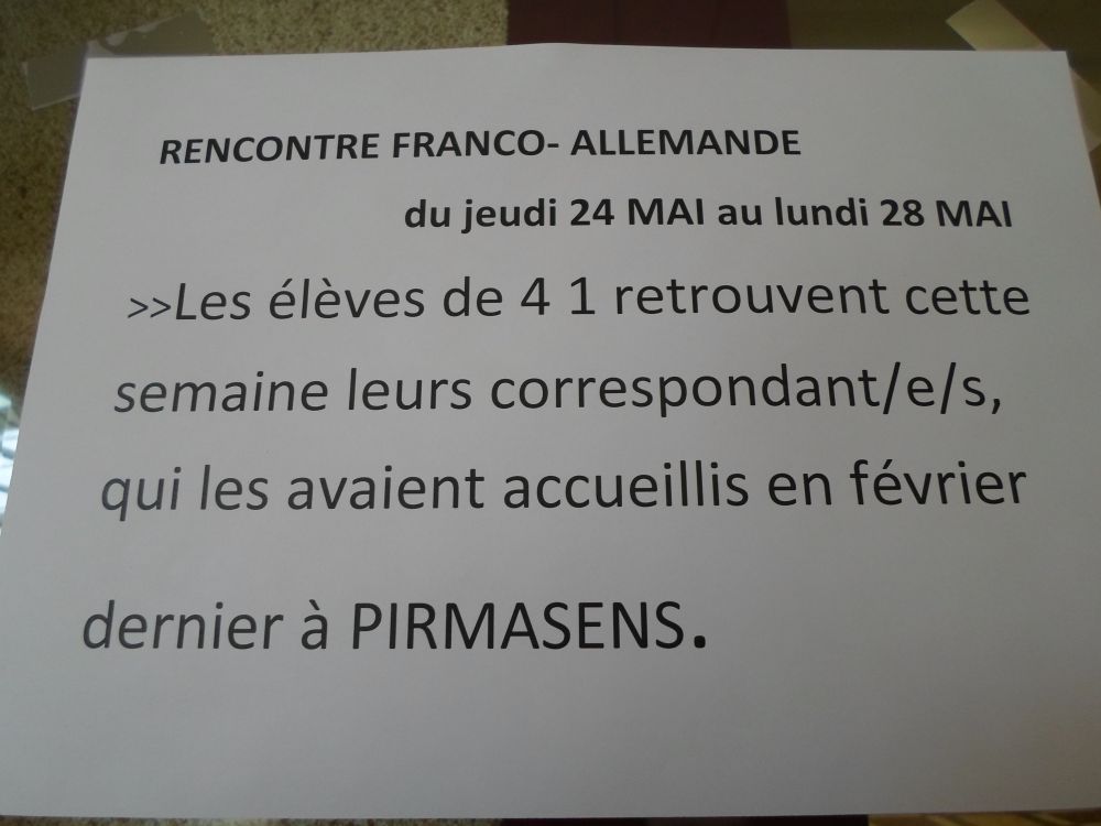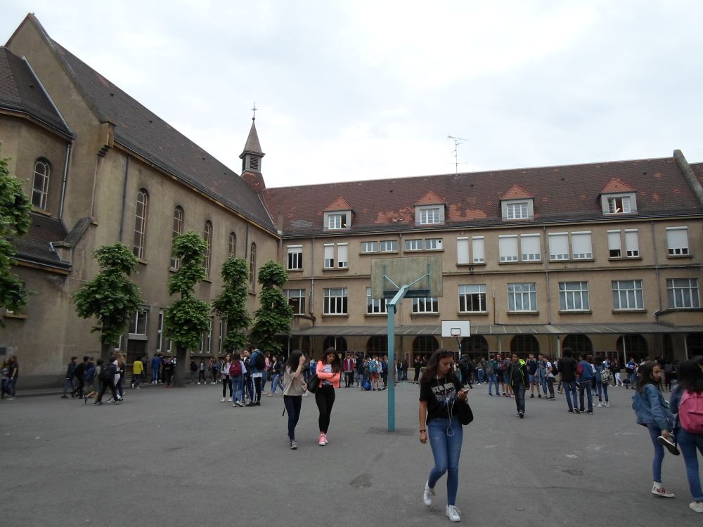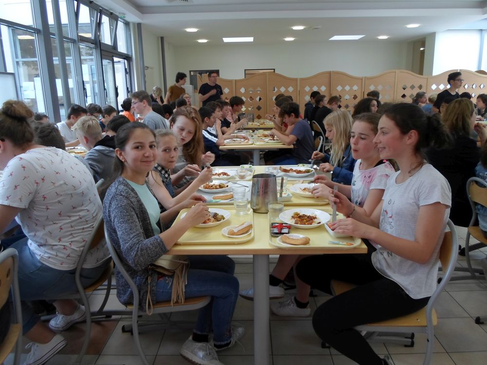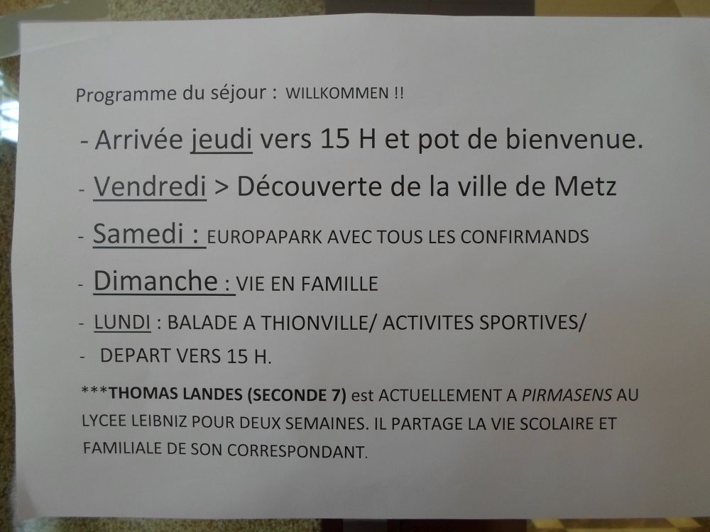 Am Donnerstag den 24.5. um 8 Uhr fuhren wir los. Alle freuten sich schon darauf ihre Austauschpartner/innen wieder zu sehen. Doch erst besuchten wir noch die Stadt Metz. Mit dem Kunstmuseum starteten wir, danach eine Stunde Freizeit in dem riesigen Einkaufszentrum Muse. Mit einer deutschen Stadtführerin erkundeten wir dann noch die Stadt um den Hauptbahnhof und um 14:00 Uhr fuhren wir weiter und kamen dann auch schon um 14:45 Uhr in der Notre Dame Schule in Thionville an. Mit einem Willkommens-snak begrüßten sie uns herzlich. Danach folgten wir den Franzosen, die einen Rundgang durch die Schule mit uns machten. Um 17:00 Uhr wurden wir von unseren Gasteltern abgeholt.