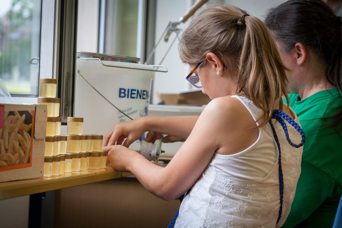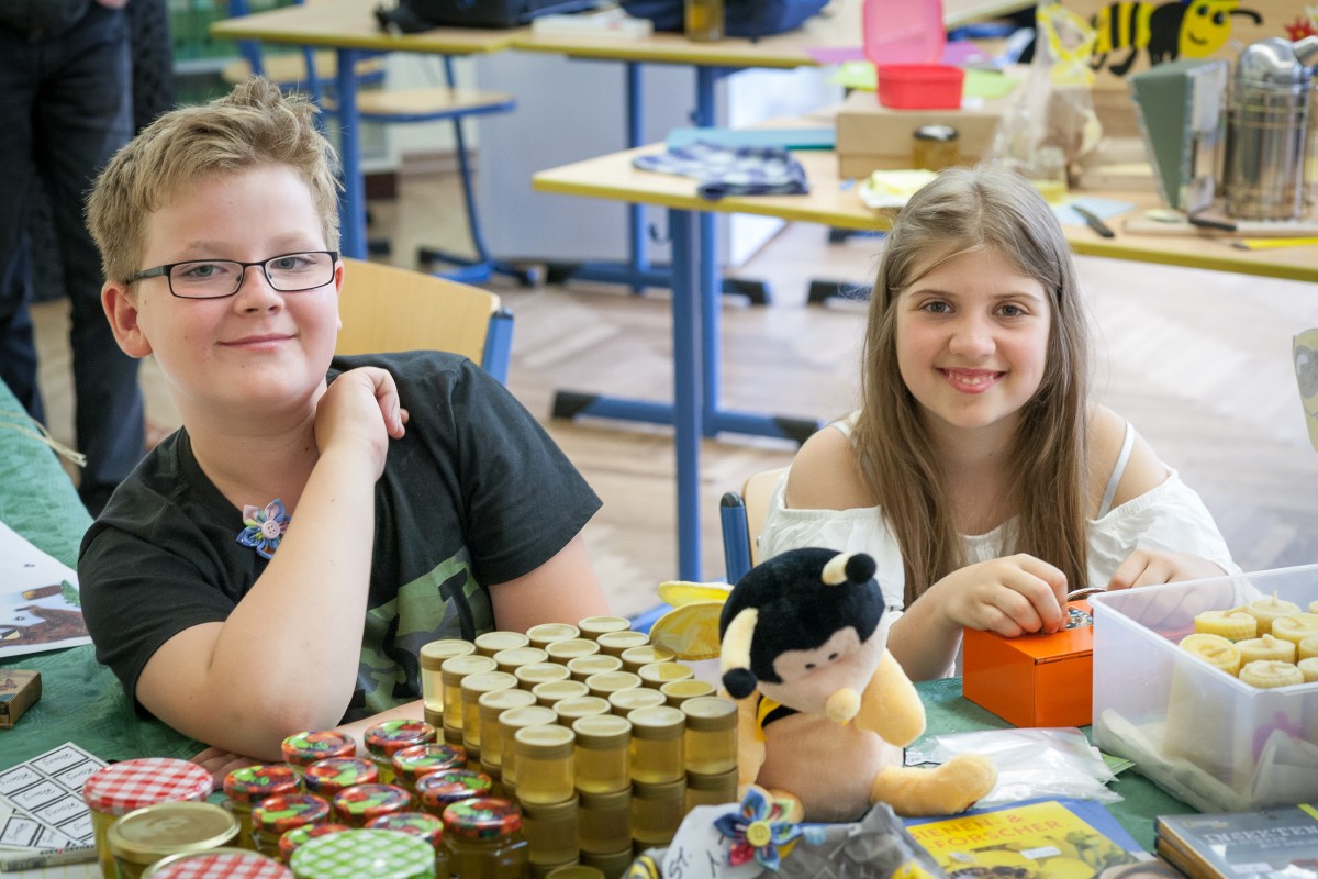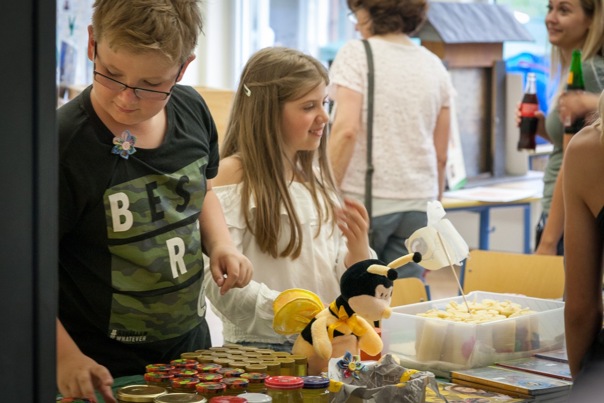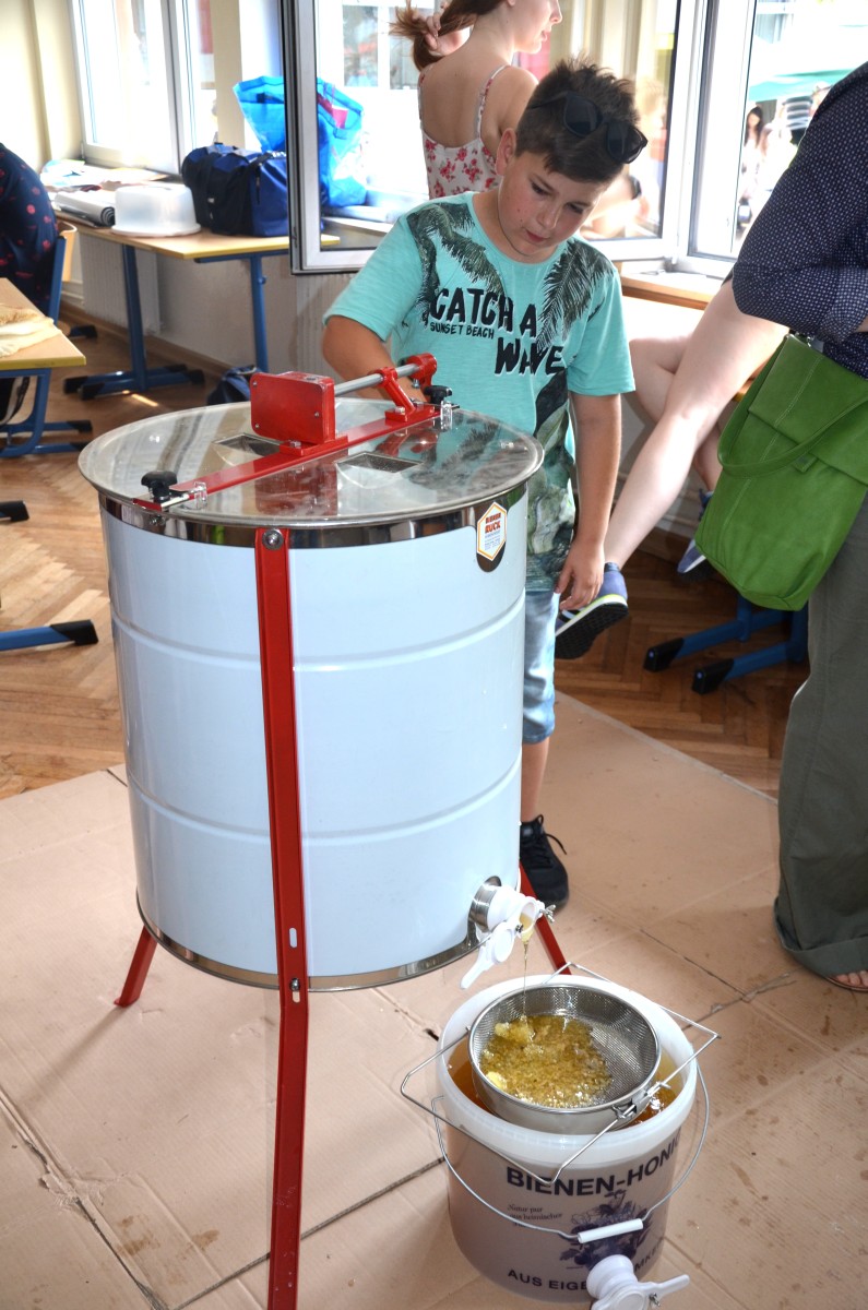 Das Wetter hatte es wieder gut gemeint mit dem jährlichen Schulfest am Leibniz. Zwei Wochen vor den Ferien wartete der fällige Gewitterregen passgenau bis eine halbe Stunde nach dem offiziellen Ende. Die Schulgemeinschaft erlebte ein abwechslungsreiches Fest, das von der Schülervertretung (unterstützt vom Hausmeister), den Klassen und Kursen, den Eltern sowie dem Kollegium gründlich vorbereitet war. Das aus den letzten Jahren bewährte Konzept wurde noch einmal angepasst und die Stände u. a. in die Mitte des Hofes gerückt, was die Atmosphäre noch einmal verbesserte. Wir konnten uns über viele Besucher freuen, die bestens unterhalten und verpflegt wurden. Eine Premiere in diesem Jahr: Das Schulfest war auch die Gelegenheit für die Bienen-AG, den ersten Leibniz-Honig zu schleudern und ganz frisch unter die Besucher zu bringen.