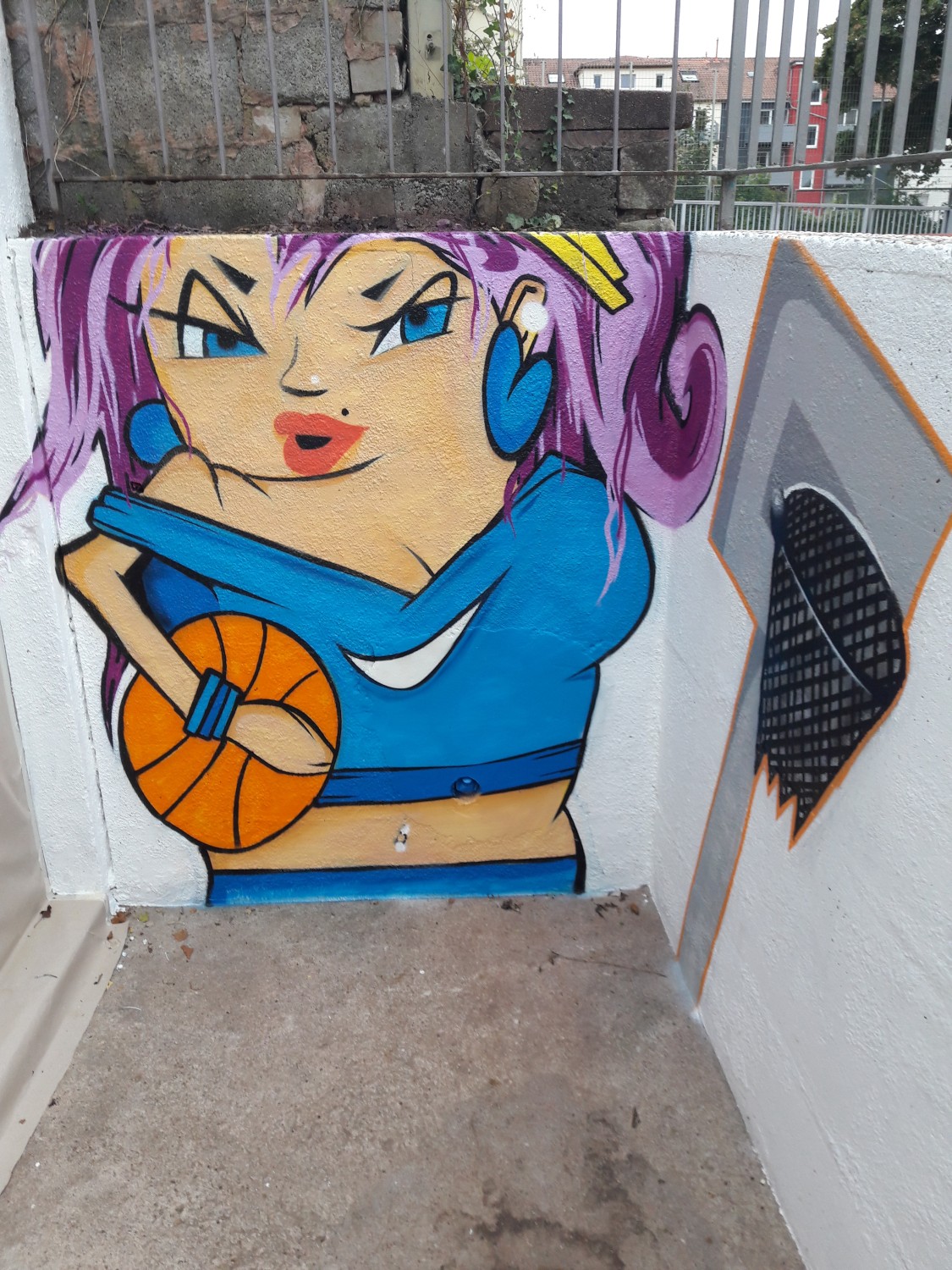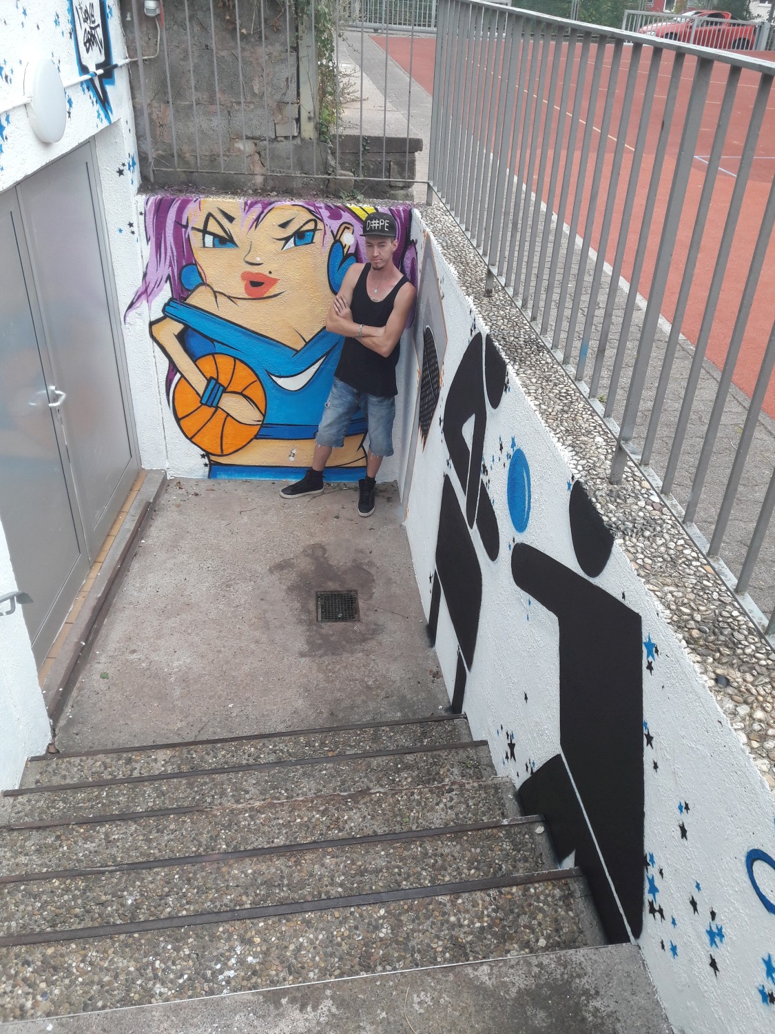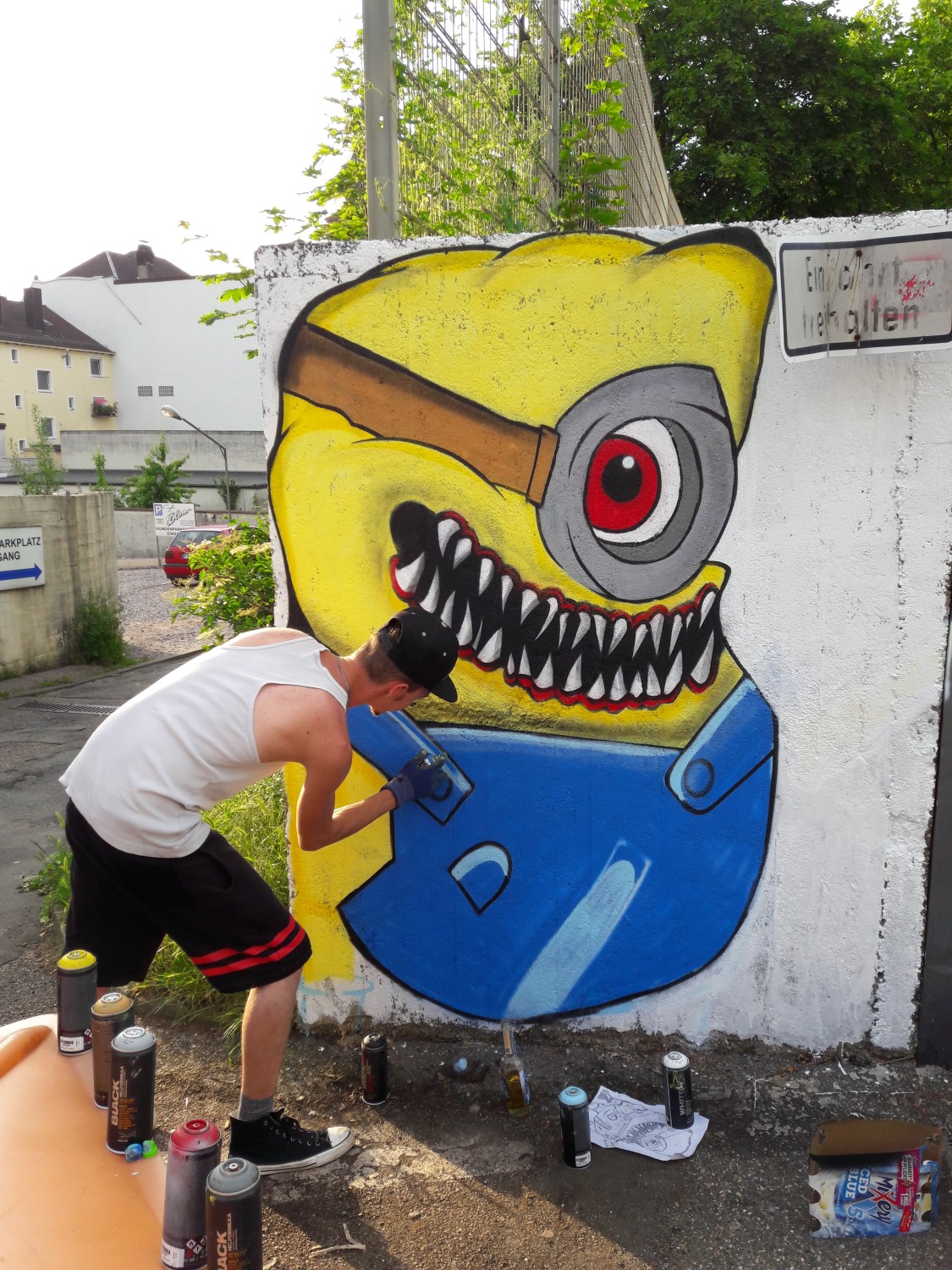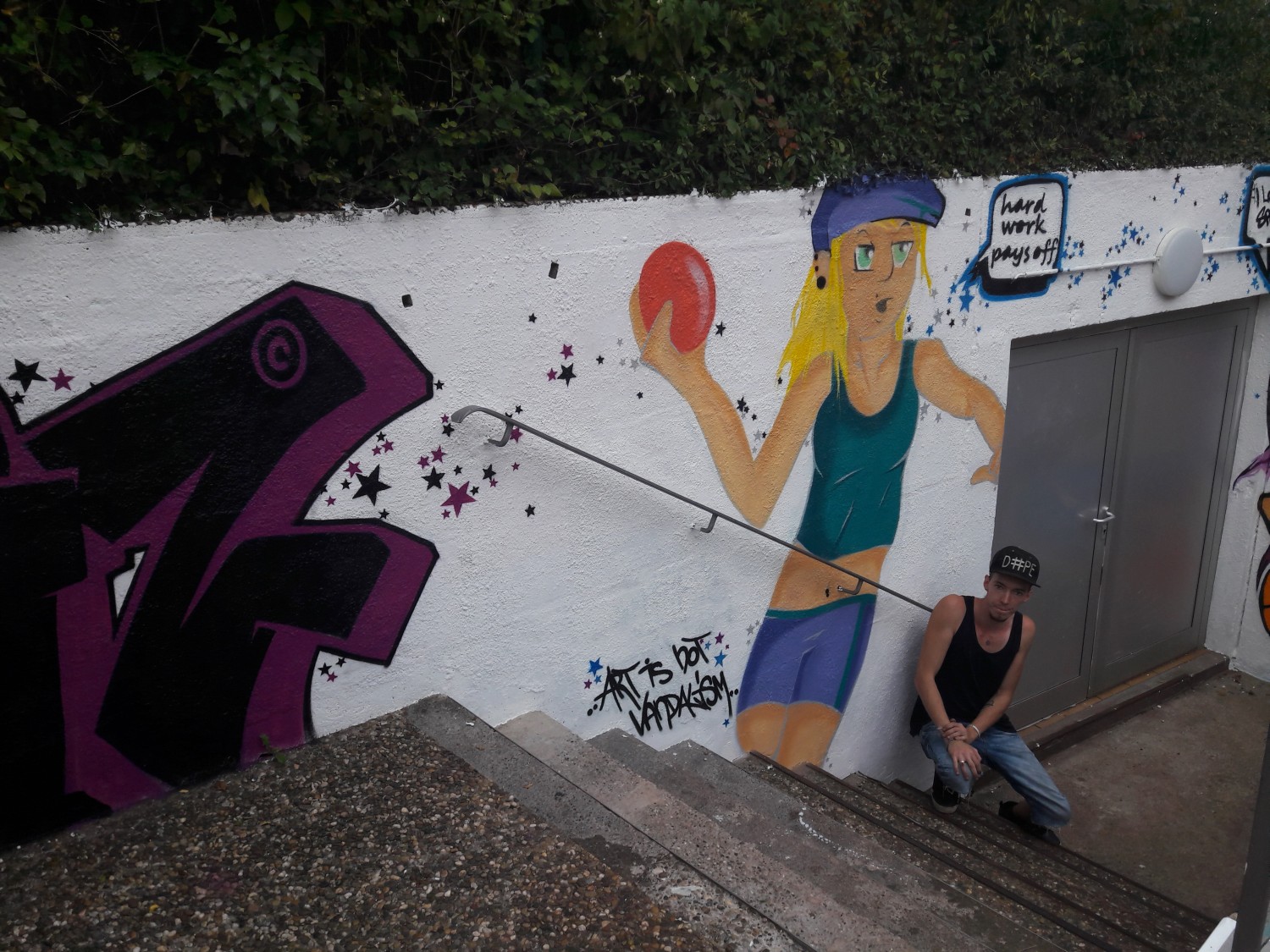 Der Graffiti-Künstler Mike Britt hat mehreren Außenwänden unseres Leibniz-Gymnasiums „neues Leben" eingehaucht. Der passionierte Graffiti-Künstler wuchs in der Nähe von Pirmasens auf. Als gelernter Maler und Lackierer machte er aus seinem Hobby seinen Beruf. Er ist kein Unbekannter in der „Sprayer-Szene"; er arbeitet legal auf Auftrag und hat schon mehrere Pirmasenser Institutionen mit seiner Kunst beglückt (z. B. das Jugendclubhaus im Erlenteich, das Regenbogen Kinderland, Räume des Malerfachbetriebes Samuel Solms). Auch das Universum Kinocenter in Landau ist von ihm verschönert worden.