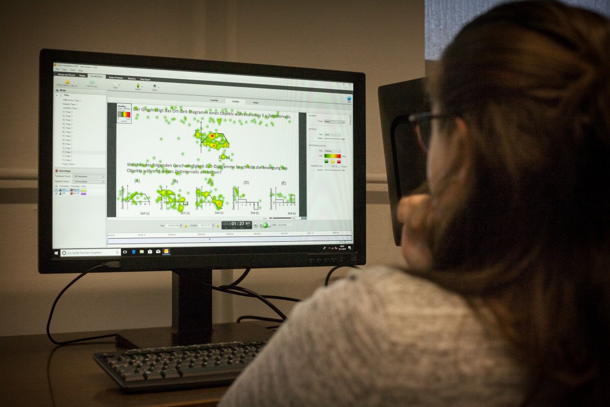Dabei ging es aber nicht nur um eine reine Abfrage von Kompetenzen im fachlichen Bereich; unsere Oberstufenschüler leisteten auch wertvolle Grundlagenforschung. Die Studie untersucht das Arbeitsverhalten von Schülerinnen und Schülern und hat zum Ziel Lernmethoden zu optimieren. Mithilfe von speziellen Sensoren (Eye-Tracker) werden die Augenbewegungen beim Bearbeiten der Aufgaben verfolgt und nach der Auswertung der Daten kann das Team der AG-Physikdidaktik Rückschüsse über den jeweiligen Lernprozess ziehen. Für die Zukunft verspricht man sich Verbesserungen für den Physikunterricht, insbesondere im Bereich des digitalen Lernens.
