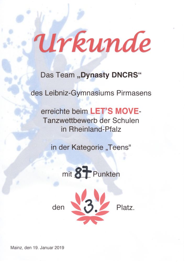 Am 19.01.2019 fuhr die Tanz-AG, bestehend aus 15 Schülern der Kursstufen 8-11, zum Tanzwettbewerb der Schulen in Rheinland-Pfalz „Lets'Move" an der Universität Mainz, der unter der Schirmherrschaft unserer Ministerpräsidentin Malu Dreyer steht. Als Begleitung fuhren Frau Theimer und Herr Dengel mit, der auch die Tanz-AG führend begleitet.