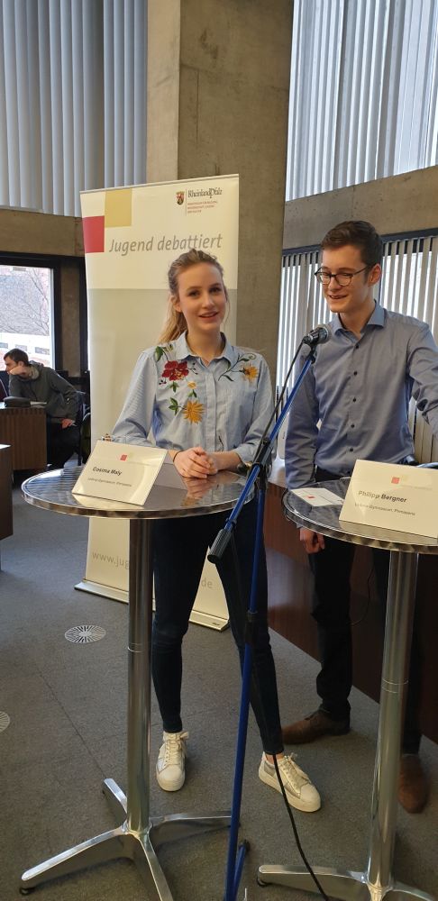 Der erste Schritt für die Teilnahme am bundesweiten Wettbewerb ist der Schulwettbewerb „Jugend debattiert", der am 23.01.2019 an unserer Schule ausgetragen wurde. Dabei konnten sich Cornelius Bergweiler (10b) und Moritz Stein (10a) in der Sekundarstufe I sowie Cosima Maly (MSS 11) und Philipp Bergner (MSS 13) in der Sekundarstufe II für den Regionalwettbewerb in Kaiserslautern qualifizieren.