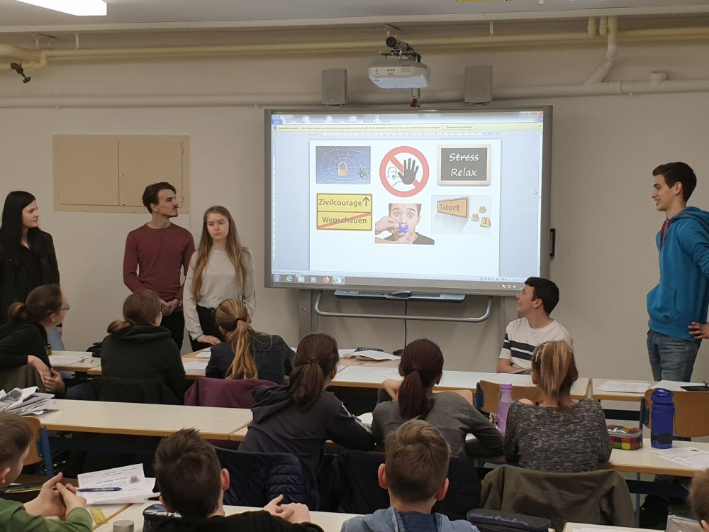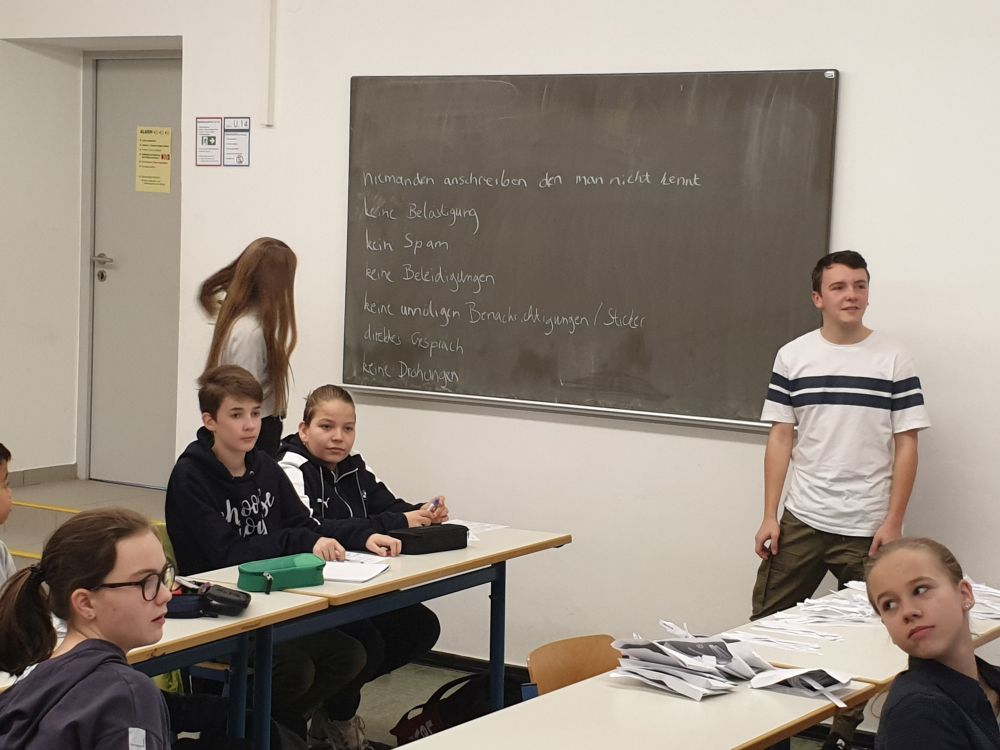 In vier Gruppen aufgeteilt wurden jeweils zwei sechste Klassen in der 1.-3. Stunde und später der 4.-6. Stunde zum Thema Cyber Mobbing unterrichtet. Die Schüler hatten teilweise schon viele Erfahrungen gesammelt, von welchen sie uns gerne berichteten und waren mit Interesse bei der Sache. Immer wieder fiel uns auf, dass dieses Thema gerade bei den jüngeren Klassen ein aktuelles Thema ist, weshalb wir zum Schluss mit den Schülern eine Liste mit ,,Chatiquette- Regeln", also dem richtigen Umgang miteinander in den sozialen Medien, aufstellten. Auch hier hatten die Schüler sehr gute Beiträge zu leisten und nach einer abschließenden Abstimmung einigten sie sich schnell auf eine Liste der wichtigsten Regeln. Zum Schluss stellten wir den Schülern noch eine App vor, auf welcher sie viele hilfreiche Tips zum Thema Cyber Mobbing, aber auch Kontaktdaten von anonymen Anlaufstellen finden können, sollten sie sich nicht an Eltern/Familie oder uns Medienscouts wenden wollen.