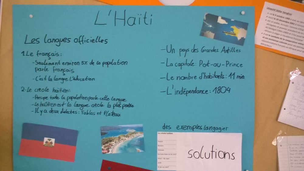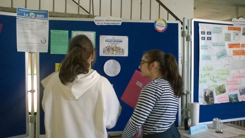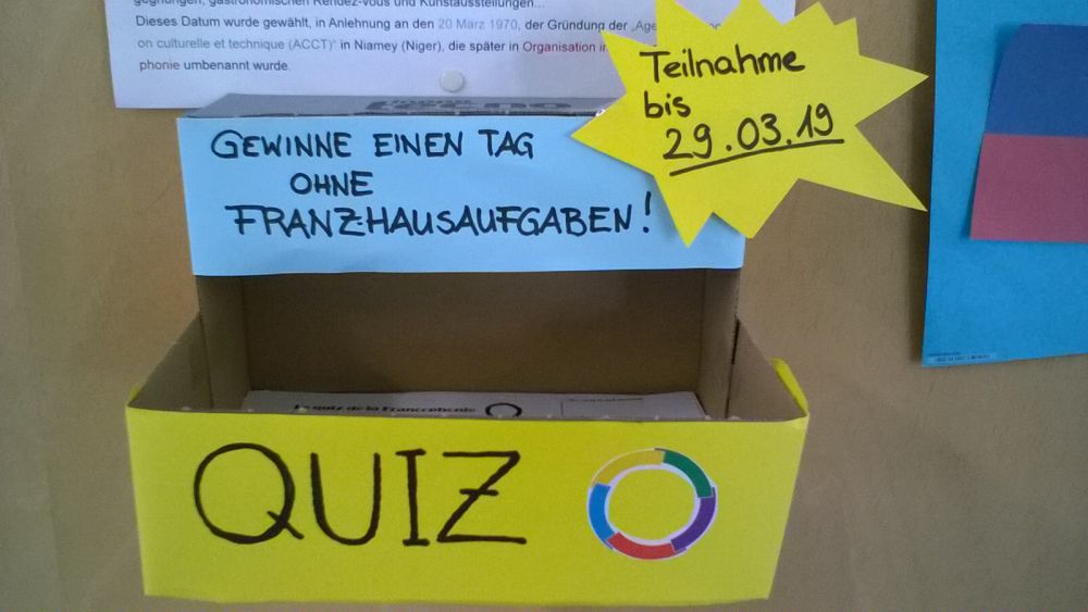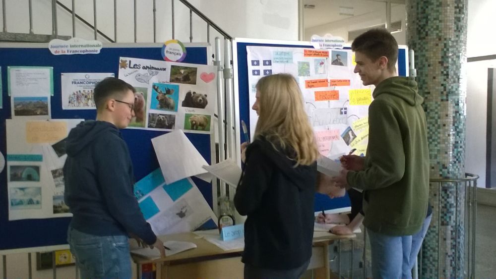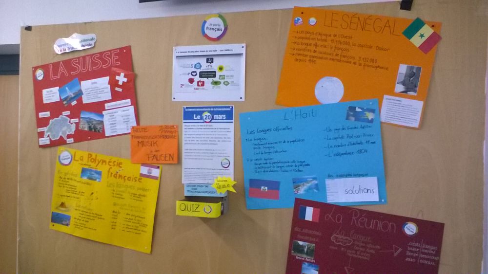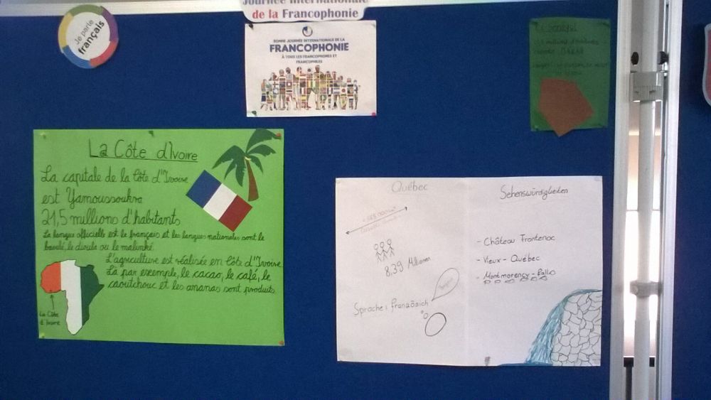Passend zum sonnigen Wetter gab es bei der Feier zum internationalen Tag der Francophonie viel gute Laune. Diese wurde bereits morgens in den Pausen, in einem, von mehreren Französisch-Klassen schön gestalteten Ambiente, ins Rollen gebracht. Interessierte Schüler und Schülerinnen konnten sich die Pausenzeit bei französischsprachiger Musik (Musik aus den Staaten, welche der Francophonie angehören) auf dem Pausenhof oder in der, mit vielen Plakaten und auch einem Quiz verzierten Aula, vertreiben. Die gute Stimmung wurde dann mittags von dem Französisch Grundkurs der 12ten Klasse weitergetragen. Denn innerhalb des Kurses wurde den Schülern die außergewöhnliche Chance zu Teil, mit einem Burkinabè (einem jungen Mann aus Ouagadougou in Burkina Faso) via Skype zu kommunizieren. Das Gespräch, welches von Frau Spitzer-Weidler organisiert wurde, verhalf zu vielen neuen und aufregenden Erkenntnissen über das Leben in Burkina Faso sowie über Kultur und Politik dieses französischen Bündnisstaates. Zum Highlight des Tages gekürt wurde jedoch das spontan ermöglichte Gespräch mit dem westafrikanischen Topmusiker Bebeto Bongo, welcher sich freudig der interessierten deutschen Klasse, den an ihn gestellten Fragen sowie auch gegenüber seinen Fans zeigte. Nach dem Skype-Telefonat ließen etliche interessierte Schüler und Schülerinnen den Nachmittag bei francophoner Musik, francophonem Essen, sowie auch anderen Schmankerln der francophonen Welt ausklingen.