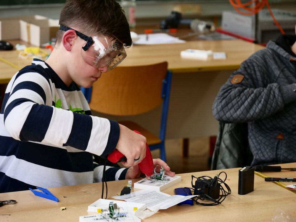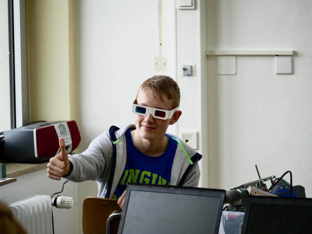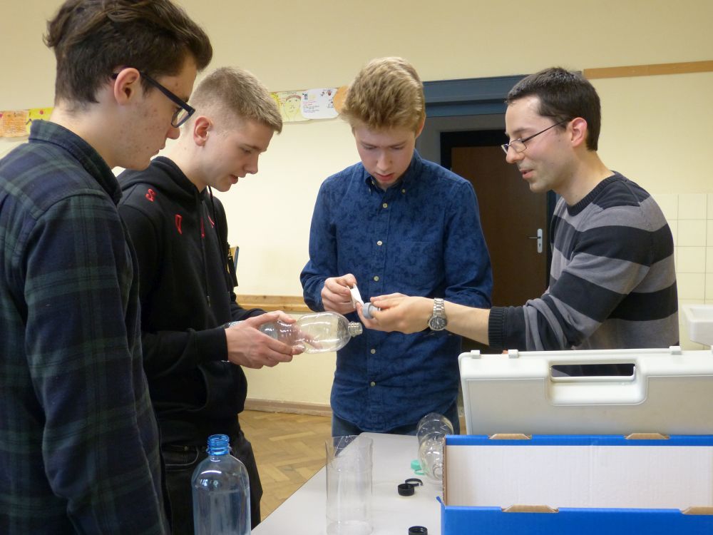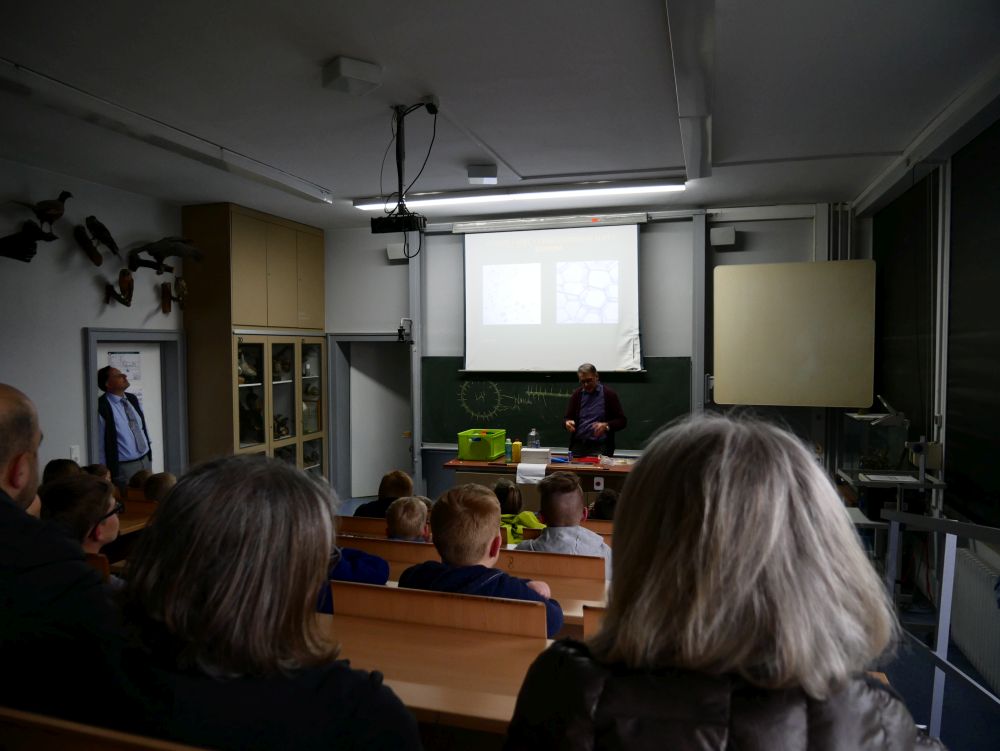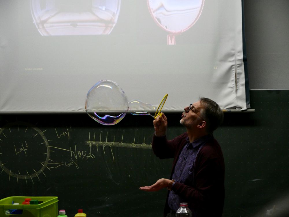 So bestand beispielsweise die Möglichkeit, mit Mikroprozessoren zu arbeiten, Roboter zu bauen und zu steuern, an einer Vogelexkursion teilzunehmen, Schweineaugen zu sezieren, die eigene DNA zu isolieren und, und, und. Um 18 Uhr konnten Eltern, Geschwister, Freunde und Interessierte die Workshops besuchen und die Ergebnisse sichten. Parallel dazu konnten jüngere Schülerinnen und Schüler an einem Vortrag von Herrn Prof. Dr. Thomas Stumm von der Hochschule Kaiserslautern zum Thema „Seifenblasen" teilnehmen und die Faszination, die den bunt, schillernden Seifenblasen innewohnt und die doch so viele Fragen aufwerfen, erleben.