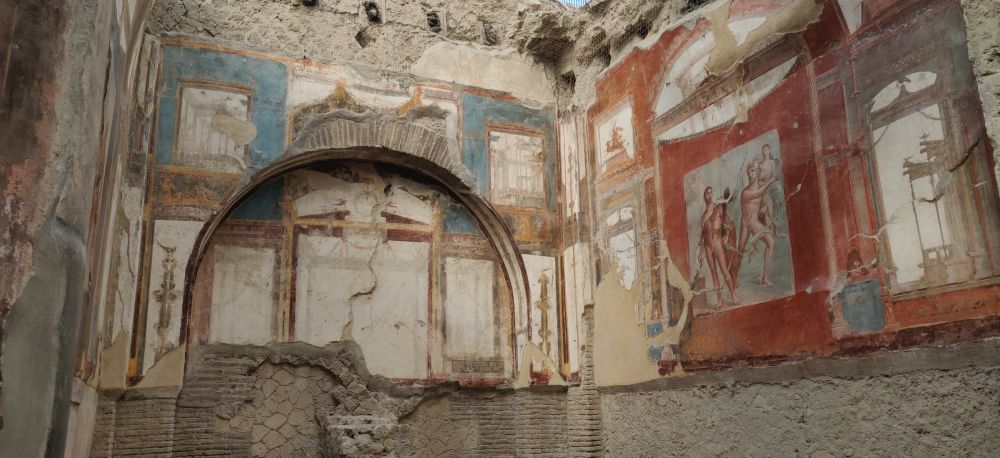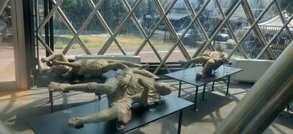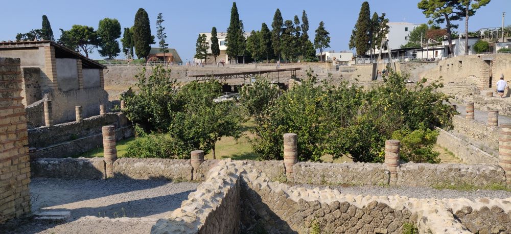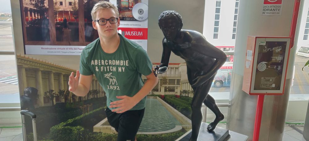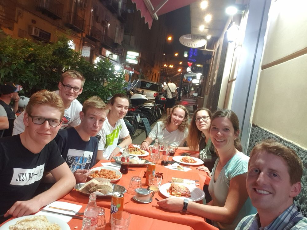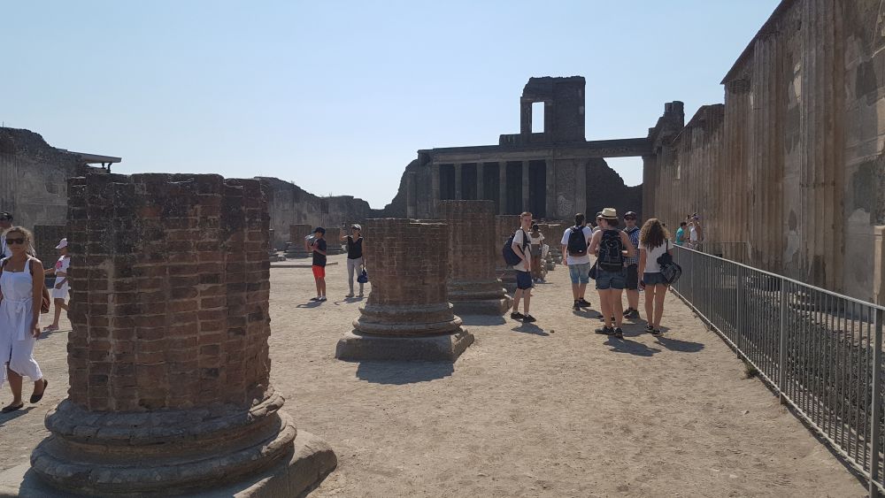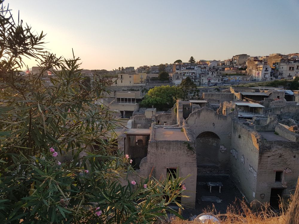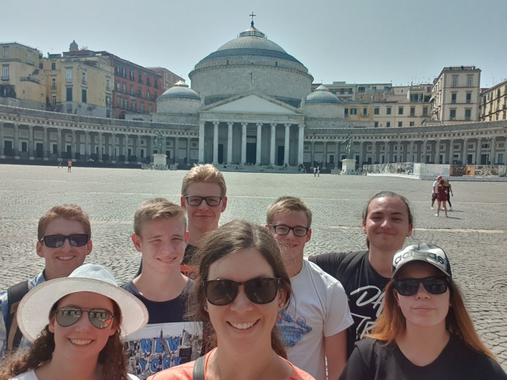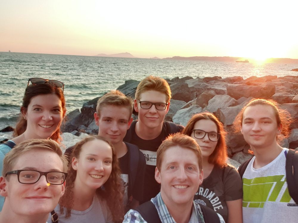 Am Mittwochmorgen des 21. Augusts machte sich unsere überschaubare Gruppe des Latein-LKs zusammen mit Frau Sooss und Herrn Lutz an die nächste Tour nach Kampanien. Gegen 7 Uhr morgens ging es für uns mit dem Zug aus Pirmasens Nord nach Karlsruhe, von wo aus uns der IC schließlich nach Basel brachte. Innerhalb weniger Stunden zogen wir durch Deutschland und die Schweiz nach Frankreich an den Airport und machten uns entspannt ans Einchecken. Entspannt gerade deshalb, weil unser Flug eine gute Stunde Verspätung hatte, die unsere Planung ein wenig über den Haufen warf. Die Zeit wussten wir aber sinnvoll zu nutzen. Die Witze und Lachanfälle die ganze Fahrt über kamen schließlich nicht von ungefähr. Nach einem bequemen Flug ohne weitere Zwischenfälle landete unsere Gruppe schließlich in Neapel, von wo aus wir direkt in unser hübsches Hotel zogen. Nach einer kurzen Ruhepause fing unser Sightseeingplan auch schon an: Abends ging es für uns Touris sofort mit der Regionalbahn in die kleinere Stadt Herculaneum, um die Ausgrabungen der Altstadt zu besichtigen. Hier machte uns unser verspäteter Flug allerdings einen Strich durch die Rechnung, denn die Ausgrabung war bereits geschlossen. Dennoch wussten wir uns zu helfen und machten einen Abstecher ans Meer, begeisterten uns an unserem ersten italienischen Eis und probierten die italienische Küche, die uns die nächsten gemeinsamen Abende mit Pizza und Pasta begleiten sollte.