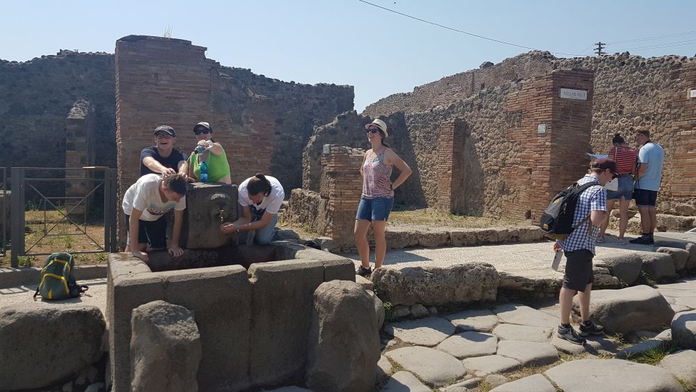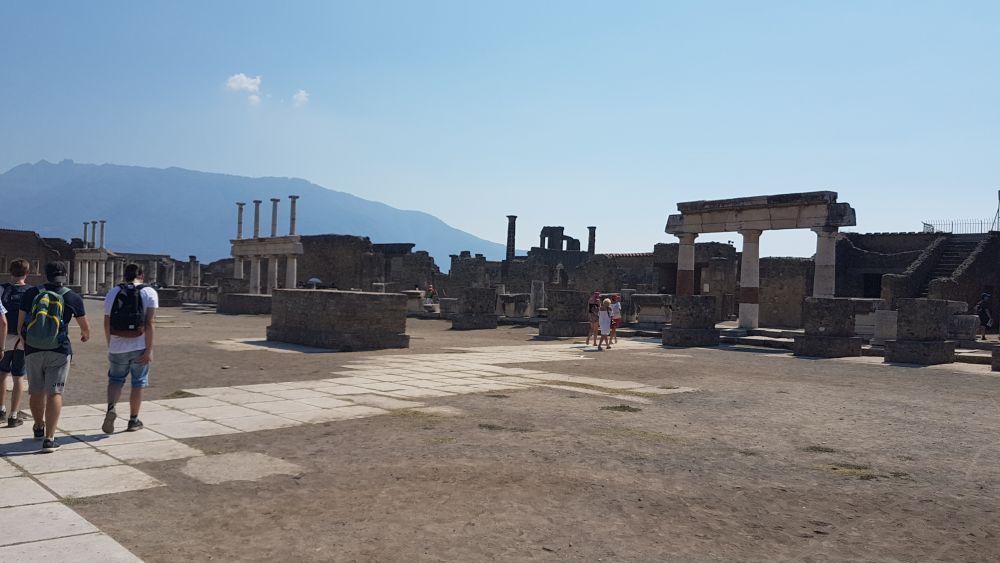 Am nächsten Morgen nach einer relativ kurzen Nacht machten wir uns nach einem regelrechten Nutellaschock beim Frühstück daran, unsere Pläne aufzuholen: Sofort ging es zurück nach Herculaneum, um schlussendlich doch die Ausgrabungen zu besichtigen und die tragische Geschichte der Stadt zu erleben. Selbstverständlich verschonte Herr Lutz auch uns nicht und traditionsgemäß durften wir damit beginnen, unsere Vorträge zu den einzelnen Sehenswürdigkeiten zu halten. Gleich danach ging es auch schon weiter nach Pompeji. Währenddessen war die Temperatur schon längst über 30 Grad geklettert. Bei guten 35°C geisterten wir mehrere Stunden durch die riesige Altstadt Pompejis. Bei dieser Hitze erwiesen sich uns die antiken Brunnen in der gesamten Stadt als Segen. Die Erleichterung war uns förmlich anzusehen. Von Brunnen zu Brunnen hetzend schafften wir es schließlich durch die ganze Stadt und machten uns auf zum nächsten Highlight: Mit dem Bus ging es schließlich den Vesuv hoch, auf dessen Spitze allerdings ein weiterer heißer, steiler Fußweg auf uns wartete. Doch die Mühe zahlte sich aus: Oben erwartete uns eine erstaunliche Aussicht auf den Golf von Neapel, Herculaneum und Pompeji und auch der Blick in den Krater war beeindruckend. Dieser Tag war mit Abstand am anstrengendsten, doch es hatte sich gelohnt. Wir waren in Herculaneum, Pompeji, auf dem Vesuv und das allerwichtigste: Wir hatten unser erstrebtes Schrittziel von über 30.000 erreicht, mehr wollten wir auch gar nicht.