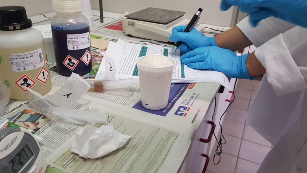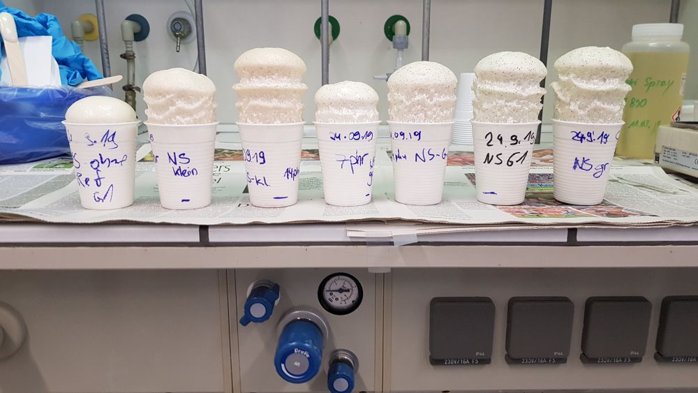Zunächst haben wir einleitende Vorträge von Herrn Göpel, Presse- und Kommunikationsarbeit der Chemieverbände Rheinland-Pfalz, und Herrn Stumm, Studiengangsleiter Angewandte Chemie Hochschule Kaiserslautern, gehört. Danach wurden wir in drei Gruppen eingeteilt, die gemeinsam verschiedene Experimente durchführten. Zu diesen gehörten das Aufschäumen von Polyurethan, Testen von Superabsorbern in Windeln und die Herstellung von Flummis.