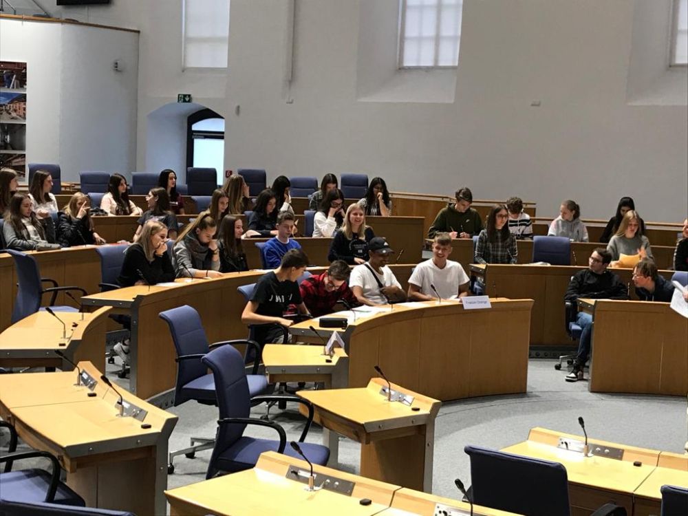 Am Donnerstag, dem 24.10.2019, fuhr die gesamte Klasse 10 des Leibniz-Gymnasiums nach Mainz in den rheinlandpfälzischen Landtag. Dort verbrachten wir den Vormittag im Plenarsaal und führten ein Rollenspiel durch, welches uns die echten Plenarsitzungen der Abgeordneten näher bringen sollte. Wir durften über die Streitfrage "Führerschein ab 16 Jahren" diskutieren, dazu wurden wir alle einer Fraktion zugeteilt, die jeweils eine andere Meinung zu dem Thema hat.