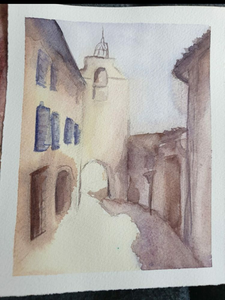 Es wurde zuerst eine monochrome Tonwertskizze angefertigt, sodass man die verschiedenen Hell- und Dunkelkontraste erkennen konnte. Diese brauchte man um später das richtige Aquarell anzufertigen. Nachdem die Tonwertskizze angefertigt wurde, fertigte ich eine Bleistiftskizze auf Aquarellpapier. Schließlich suchte ich mir 4 Farben aus, die ich für mein Aquarell verwendete. Diese sind die einzigsten Farben, die man für sein Aquarell verwendet. Durch Mischen und bestimmten Techniken beim Auftragen der Farben kann man bestimmte Stimmungen und Ergebnisse erzielen. Besonders wichtig bei der Aquarellmalerei ist der Einsatz von Wasser. Man platziert die Farbe und das Wasser so auf dem Papier, dass die Farben fließen und sich unkontrolliert verteilen, so erhält man die schönsten Ergebnisse. Deswegen auch das ,, spontane" Aquarell, da man nicht weiß, wie sich die Farben verteilen. Da man auch nichts beeinflussen soll, sondern die Farbe macht, was sie will.