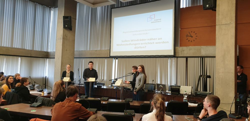 Sandro Sprau und Lucas Kehrer hatten sich zuvor beim Regionalwettbewerb für das Finale qualifiziert. Bei der Debatte der Schülerinnen und Schüler aus der Sekundarstufe I ging es um das Thema „Sollen Windräder näher an Wohnsiedlungen errichtet werden dürfen?"