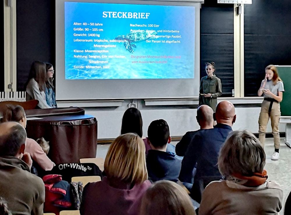 Alle Schüler bereiteten ihre Ergebnisse für eine publikumswirksame Präsentation auf. Zahlreiche Eltern erlebten, wie ihre Kinder das Lampenfieber mit unterhaltsamen Darbietungen bewältigten und mit dem Publikum gelegentlich durch eingeschobene Rückfragen aktiv interagierten.