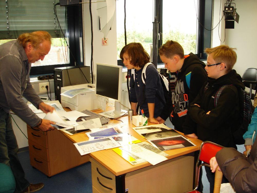 Dann gingen wir in den 6. Stock. Die andere Gruppe tauschte also mit uns. Als wir mit großer Mühe oben ankamen, kam uns Herr Emlich entgegen. Bei ihm lernten wir, wie man einen Finger- und Fußabdruck sichern kann. Wir sicherten die Fingerabdrücke zweier Schüler. Mit UV- Licht kann man unsichtbare Schriften sichtbar machen.