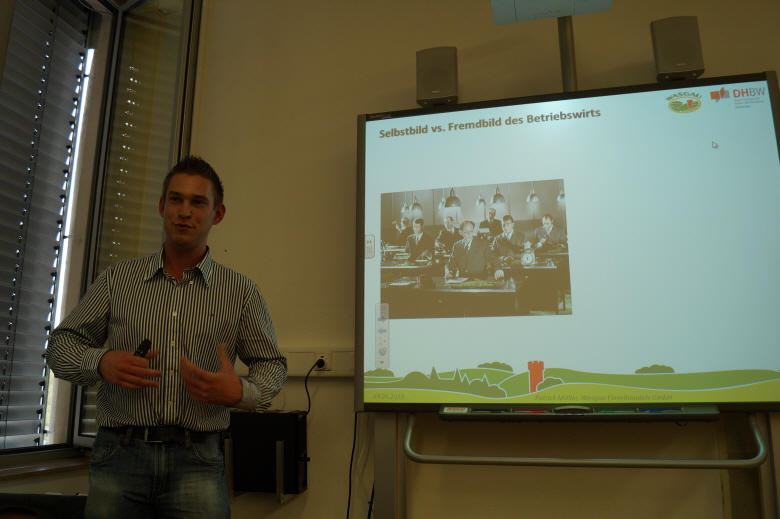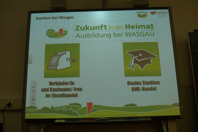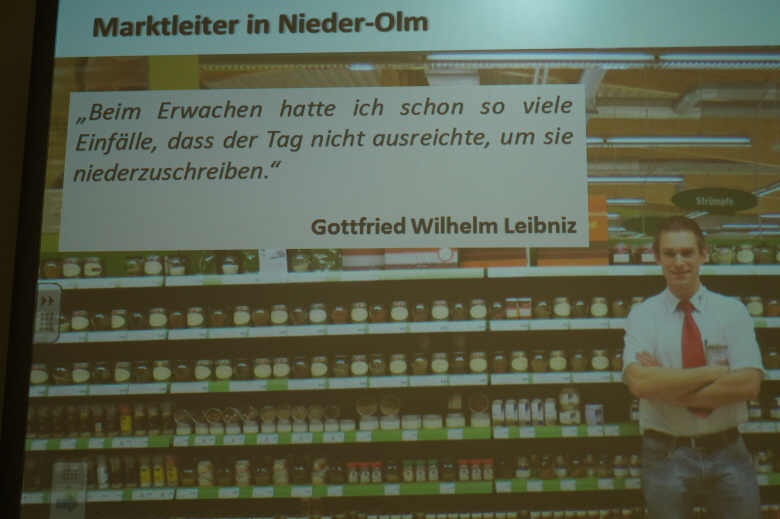 Im Rahmen der Projektwoche zum 125-jährigen Schuljubiläum des Leibniz-Gymnasiums besuchten ehemalige Leibnizschüler jede Klasse der Schule. In unsere 10c kam mit Patrick Müller (24 Jahre) der jüngste von allen. Der Wasgau-Marktleiter, der 2008 erfolgreich sein Abitur an unserem Gymnasium bestand, und danach ein sechs Semester andauerndes duales BWL-Studium (studieren & arbeiten) bewältigte, beschrieb seinen Werdegang anschaulich und mit viel Witz.