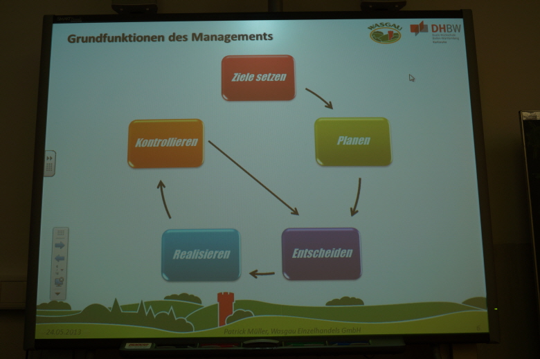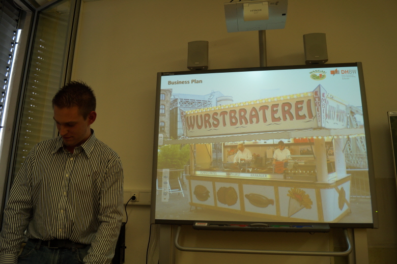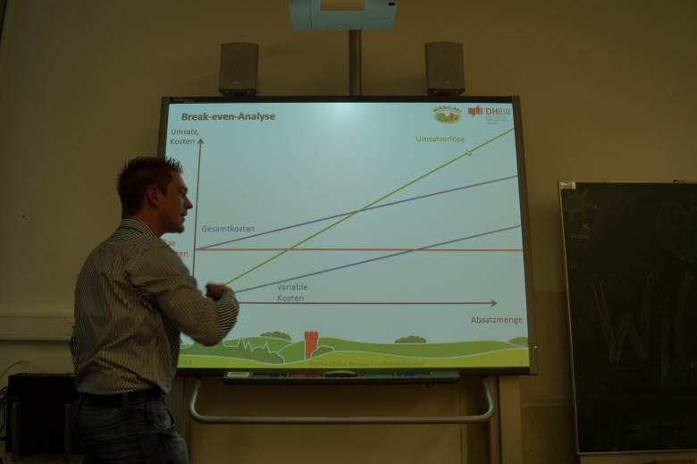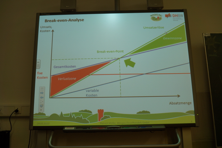 Zuerst erklärte er uns anhand eines Beispiels, nämlich der Eröffnung eines Bratwurststandes, BWL, was er mit Hilfe einer Break-Even-Analyse verdeutlichte. Dann erzählte er uns etwas über seine Arbeit als Marktleiter in der Wasgau und seine weiteren Lebensziele.