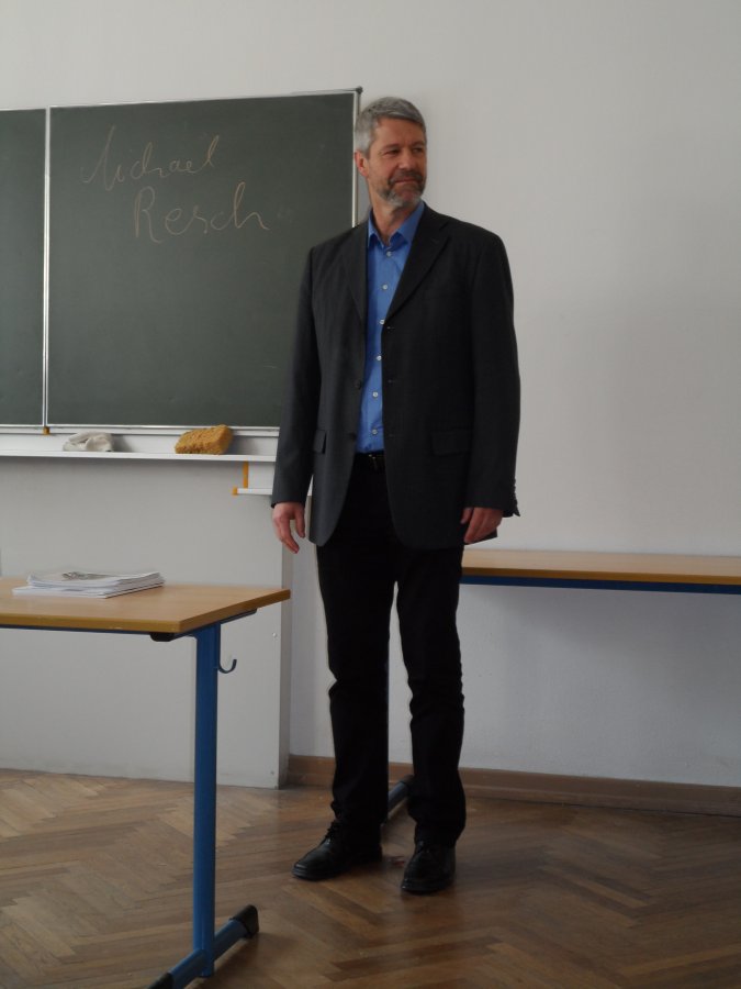 Am 24.05.2013 kam Herr Michael Resch, ein ehemaliger Schüler des Leibniz-Gymnasiums, zu uns in die Klasse und erzählte uns etwas von seinem Werdegang und informierte uns über seine Firma, in der Cardio- und Kraftgeräte für den Einsatz in Therapie und Fitness entwickelt und hergestellt werden. Die Stunde wurde für die zuhörenden Eltern, geschweige denn für uns, nie langweilig. Denn Herr Resch machte auch sehr oft Witze, stellte viele Fragen und forderte uns auf, Vorschläge für Komponenten eines guten Sportgerätes zu machen, die er dann zeichnerisch an der Tafel umsetzte.