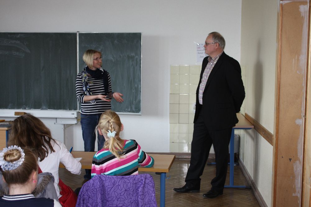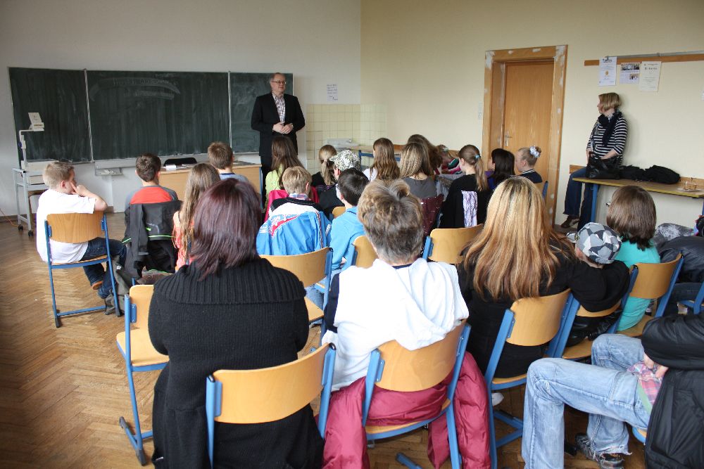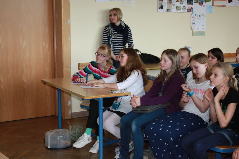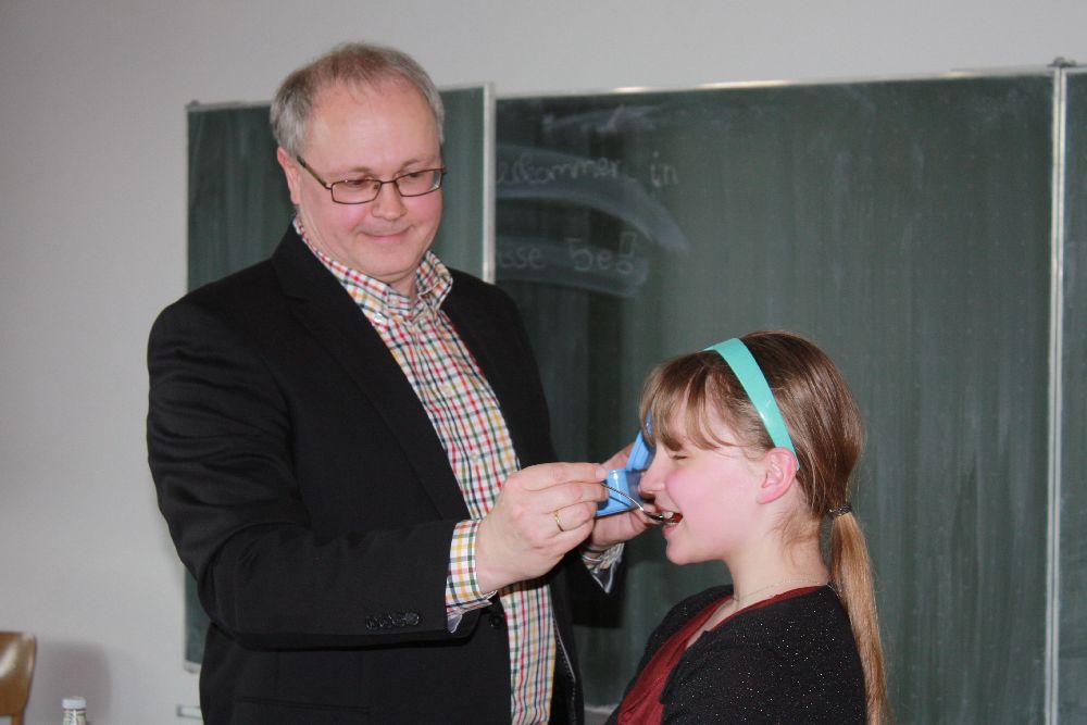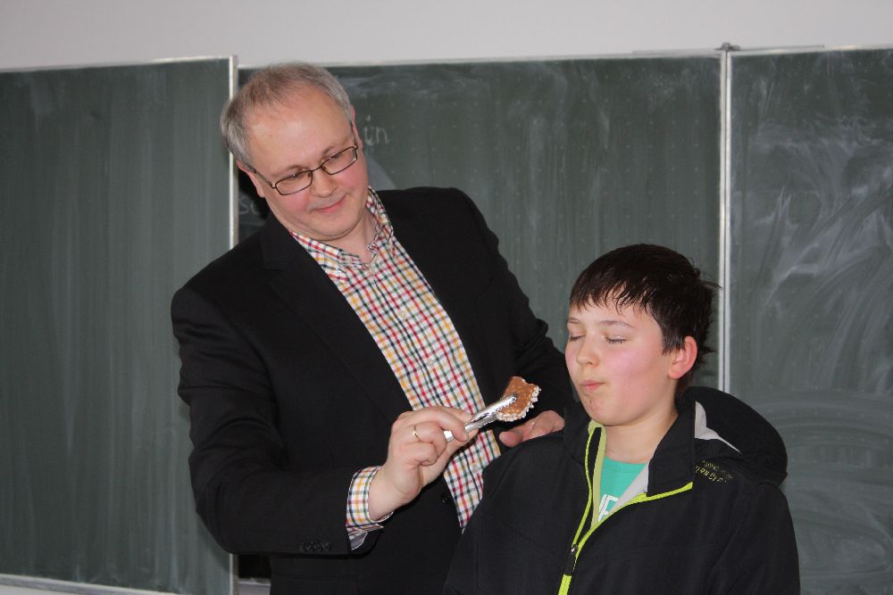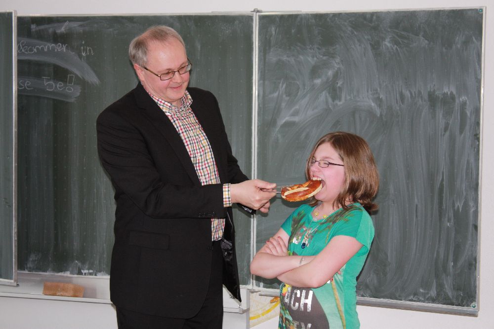 Auch unsere Klasse profitierte von Herrn Cronauers Wissen über die Pfalz, das er uns auf spielerische und lustige Weise vermittelte: Er verschaffte uns z.B. einen Überblick über die wichtigsten Städte der Pfalz und deren Einwohnerzahlen und informierte weiterhin auf spielerische Art und Weise über Produkte aus der Pfalz, die heute weltweit bekannt sind, indem er diese von Schülern mit geschlossenen Augen „erschmecken" ließ, was natürlich nicht ohne Lachen der Mitschüler und Eltern geschah. Unter den Produkten waren z.B. der Wawi Schoko-Reis oder eine Brezel, deren Name vom lateinischen Wort brachium (Arm) abgeleitet wird.