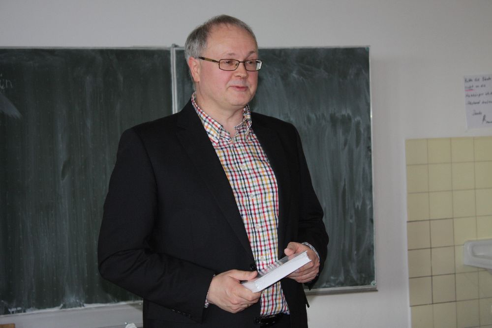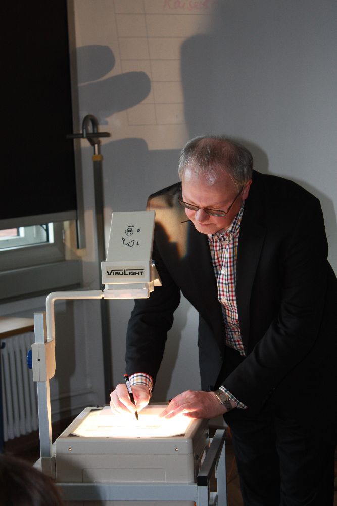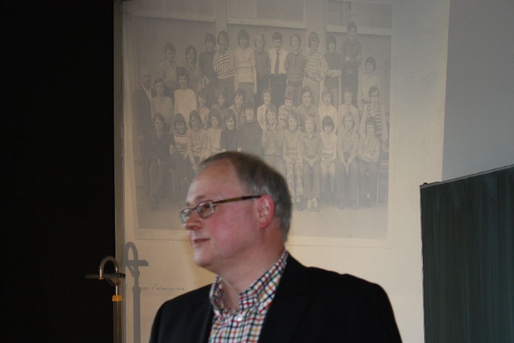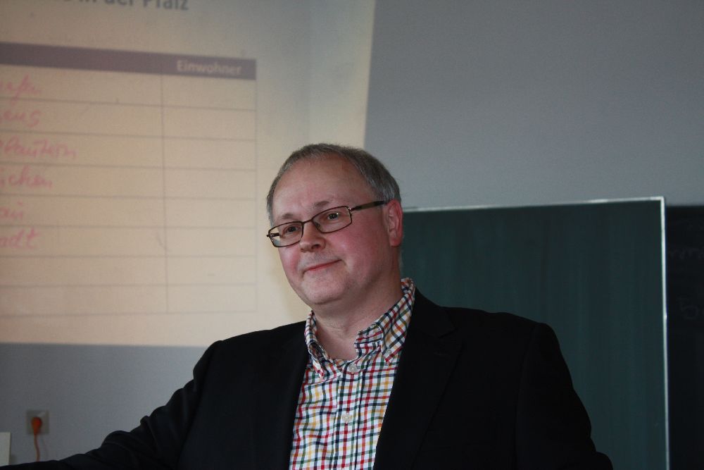 Nach einem kurzen Bericht über seine Schulzeit an unserer Schule, bei dem er uns auch ein Klassenfoto aus dieser Zeit gezeigt hatte, informierte er uns über seinen weiteren beruflichen Werdegang: Nach dem Abitur machte Herr Cronauer eine Ausbildung bei der AOK und arbeitete anschließend auch für die Pirmasenser Zeitung und im Radiostudio Bitch. In dieser Zeit hat er aufgrund seines großen Interesses für die Pfalz damit angefangen, sein persönliches Handbuch mit Informationen über die Pfalz anzulegen, aus dem sich dann im Laufe der Zeit ein umfangreiches Nachschlagewerk entwickelte, das heute unter dem Titel „Jürgen Cronauer's Pfalzlexikon" im Verlag Arbogast erschienen ist.