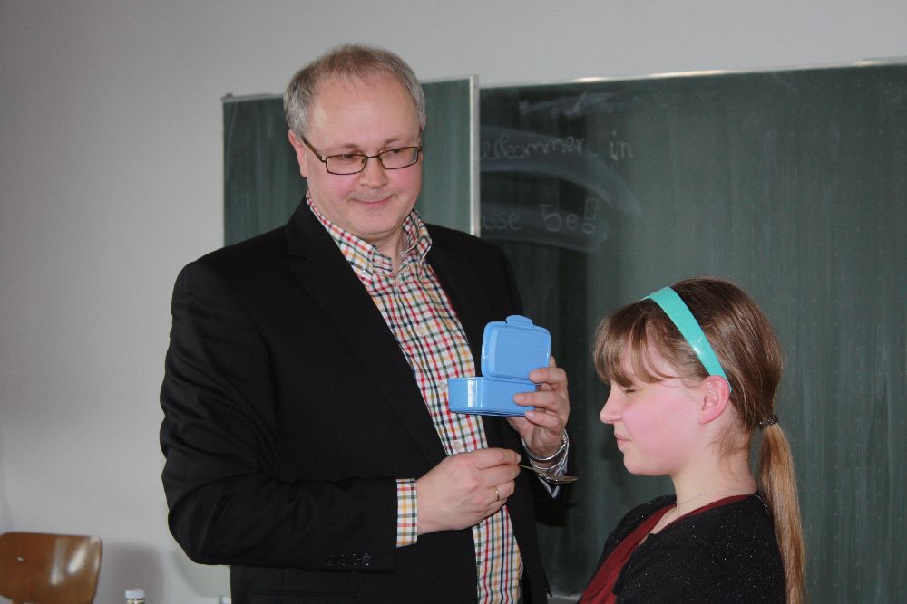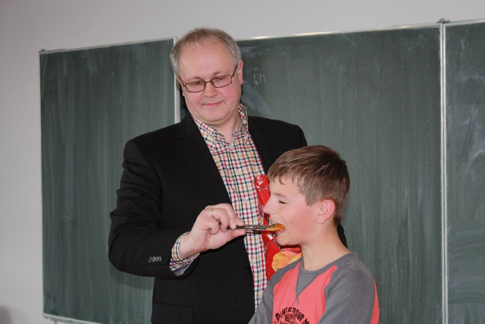 Damit unsere Klasse an diesem Tag nicht hungrig nach Hause gehen musste, hatte Herr Cronauer von allen vorgestellten Produkten genügend für die Schüler und Eltern der Klasse zum Essen mitgebracht. Zum Abschluss seines interessanten Vortrages schenkte er der Klasse ein Exemplar seines Pfalzlexikons, das er Frau Weiß überreichte. Frau Weiß bedankte sich im Gegenzug bei Herrn Cronauer mit Pralinen, die übrigens aus unmittelbarer Nachbarschaft der Schule stammen.