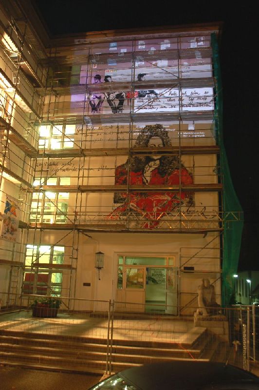 Zu Beginn der Sommerferien kündete ein Gerüst von einem neuen Blickfang für das Leibniz: Von der Künstlerin Marie Gouil wurde die Fassade im Bereich des Eingangs durch ein riesiges Gemälde zu einem weithin sichtbaren Anziehungspunkt.