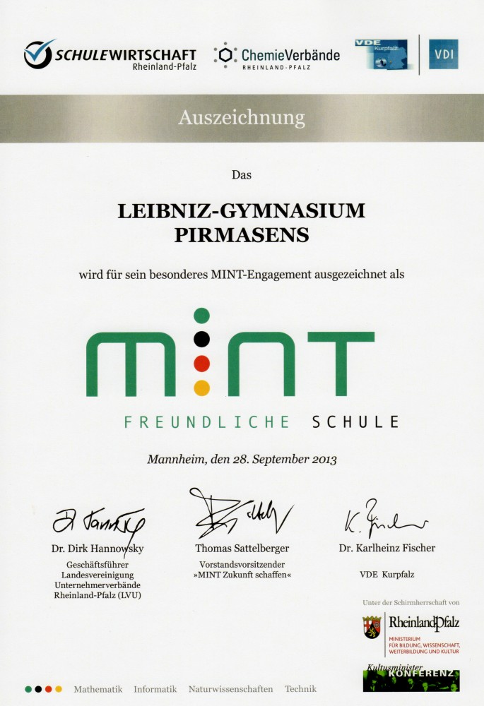 Im TECHNOSEUM in Mannheim erhielt unsere Schule am 28. September 2013 die Auszeichnung „MINT-freundliche Schule". Damit wird der bestehende Schwerpunkt des Leibniz-Gymnasiums in den MINT-Fächern belohnt. [Mehr...]