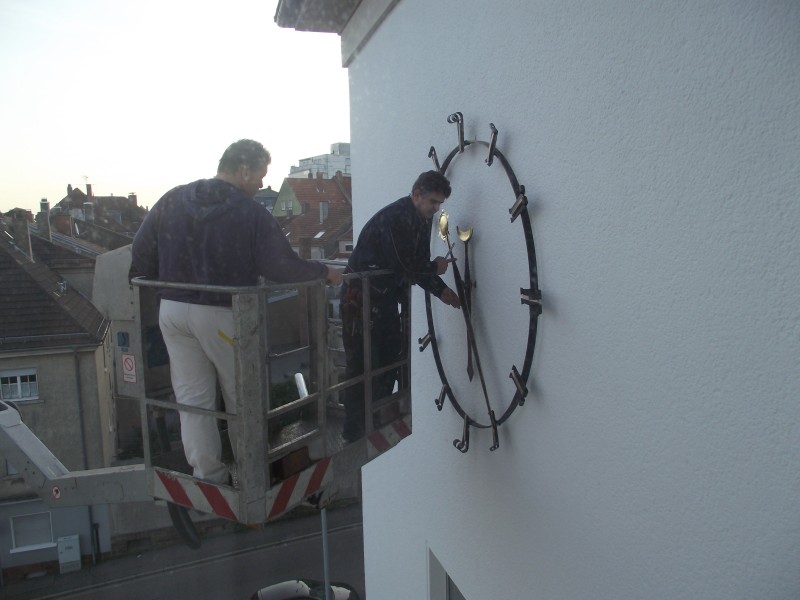 Das Gerüst zur Neugestaltung der Fassade hatten Vandalen schon am ersten Wochenende "genutzt", um die Uhr zu demolieren. Die Zeiger wurden abgerissen und das Uhrwerk beschädigt. Jetzt erstrahlt die Uhr wieder in ihrem vollen Glanz. Zwei komplett neue Zeiger und weitere Teile mussten erstellt und die Welle des Uhrwerks mittels Hubsteiger getauscht werden.