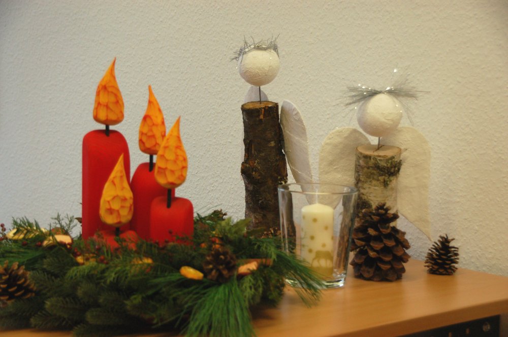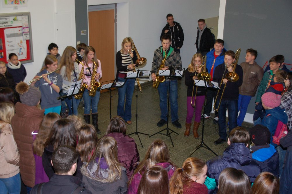 Die Schulgemeinschaft wurde zum Start der Weihnachtsferien von einer Bläsergruppe (geleitet von Frau Knörzer) überrascht, die zur Pause in der Aula aufspielte. Schon vor Tagen hatte Frau Gottert wie jedes Jahr die Dekoration im Sekretariat weihnachtlich gestaltet. Dabei kamen auch die zuvor mit Schülern gebastelten Engel zum Einsatz.