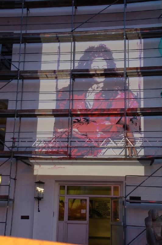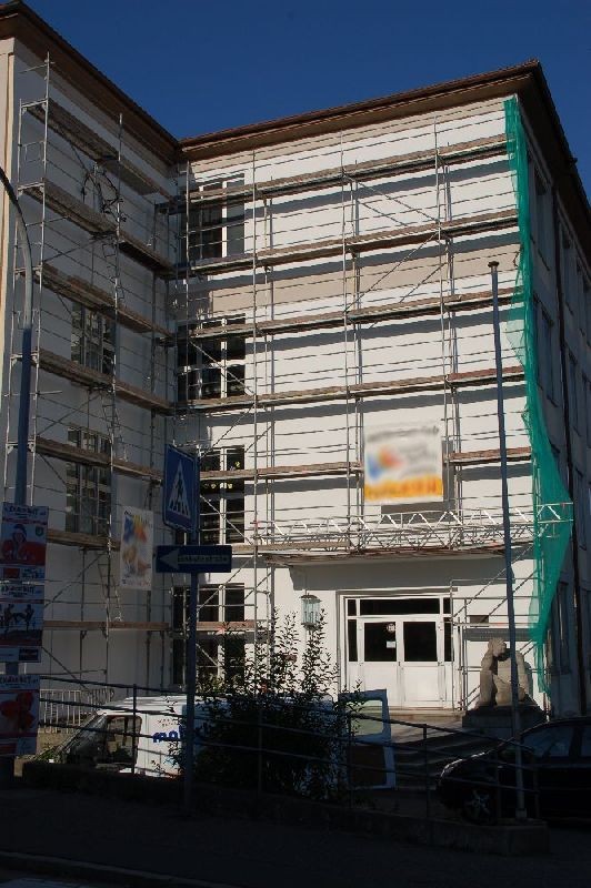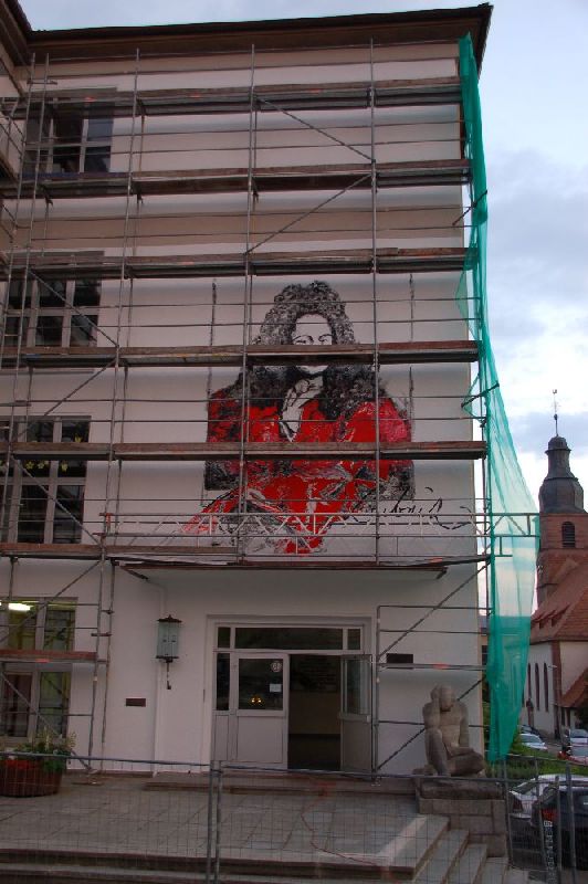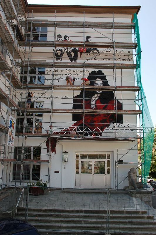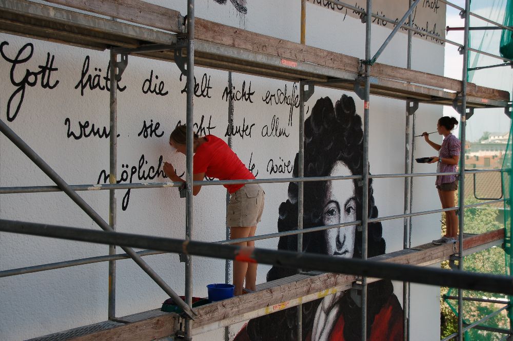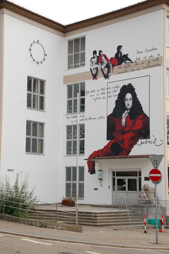 Zu Beginn der Sommerferien kündete ein Gerüst von einem neuen Blickfang für das Leibniz: Von der Künstlerin Marie Gouil wurde die Fassade im Bereich des Eingangs durch ein riesiges Gemälde zu einem weithin sichtbaren Anziehungspunkt. Frau Gouil ist an unserer Schule als Lehrerin für Bildende Kunst tätig und hat u.a. in Kaiserslautern schon ähnliche Fassaden gestaltet. Auf Anfrage war sie direkt bereit, auch das "Leibniz" mit ihrer Kunst zu verschönern. Die Stadt Pirmasens konnte für das Projekt gewonnen werden und steuerte Gerüst und Farbe bei.