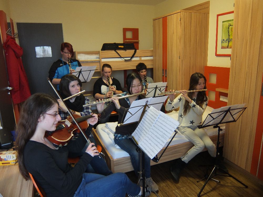 Auch wenn ein Probenraum anfangs noch nicht zur Verfügung stand, wurde kräftig geübt und so tutete, flötete und geigte es aus den Zimmern. Ziemlich schnell hatten sich die Gruppen zu wohlingenden Ensmbles zusammengefunden und das angestrebte Probensoll war viel schneller erreicht als geplant. Das verdanken wir auch den drei Abiturienten, die extra am Donnerstag zum Proben nach Bad Bergzabern kamen.